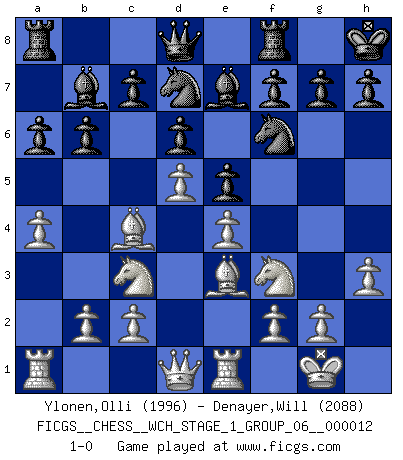 Last move : 1-0 2013 October 9 15:36:17 [Event "FICGS__CHESS__WCH_STAGE_1_GROUP_06__000012"] [Site "FICGS"] [Date "2013.07.02"] [Round "1"] [White "Ylonen,Olli"] [Black "Denayer,Will"] [Result "1-0"] [WhiteElo "1996"] [BlackElo "2088"] 1.e4 d6 2.d4 Nf6 3.Nc3 Nbd7 4.Nf3 e5 5.Bc4 Be7 6.O-O O-O 7.Re1 a6 8.a4 b6 9.h3 Bb7 10.d5 Kh8 11.Be3 1-0 This chess game has been lost on time (started : 2013.07.02 19:10:19) Pirc defense Kingside Castling by player White (move 6) Kingside Castling by player Black (move 6) Player White won this chess game. Follow this game move after move (download)Before the endgame, the Gods have placed the middle game. (Siegbert Tarrasch) Wenn ich mich einlogge, glauben die Leute gewöhnlich nicht, dass ich es selbst bin und sie fangen an, mir dumme Fragen zu stellen. Und wenn sie es glauben, stellen sie wieder andere dumme Fragen. (Judith Polgar) Si el ingenio solamente fuese necesario para lucirse, las mujeres serían las mejores jugadoras de Ajedrez del mundo. (Albin) Seul un grand joueur sait à quel point il joue faiblement. (Xavier Tartacover) Never risk one's whole fortune unless supported by one's entire army. (Niccolo Machiavelli)