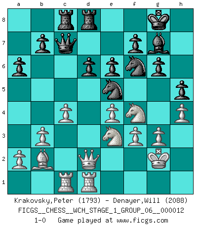 Last move : 1-0 2013 October 5 3:19:23 [Event "FICGS__CHESS__WCH_STAGE_1_GROUP_06__000012"] [Site "FICGS"] [Date "2013.07.02"] [Round "1"] [White "Krakovsky,Peter"] [Black "Denayer,Will"] [Result "1-0"] [WhiteElo "1793"] [BlackElo "2088"] 1.c4 c5 2.Nf3 Nf6 3.Nc3 Nc6 4.g3 g6 5.Bg2 d6 6.d4 cxd4 7.Nxd4 Bd7 8.O-O Bg7 9.Nc2 Qc8 10.b3 h5 11.h4 Bh3 12.Rb1 Bxg2 13.Kxg2 O-O 14.Bb2 Qd7 15.Qd2 Rac8 16.e4 a6 17.f3 e6 18.Ne3 Rfd8 19.Rfd1 Qe7 20.Ne2 Ne5 21.Rbc1 Qc7 22.Nf4 1-0 This chess game has been lost on time (started : 2013.07.02 19:10:19) English : Symmetrical variation Kingside Castling by player White (move 8) Kingside Castling by player Black (move 13) Player White won this chess game. Follow this game move after move (download)Chess is the gymnasium of the mind. (Blaise Pascal) Ich habe Kasparov in Rente geschickt. (Veselin Topalov) Una buena memoria, concentración, imaginación y una fuerte voluntad, se requiere para llegar a ser un buen jugador. (Bobby Fischer) Un footballeur joue avec ses pieds, parfois avec sa tête. Un joueur d'échecs ne joue qu'avec sa tête. Et quand il ne joue plus, il meurt. (Jacob Murray) The quality of decision is like the well-timed swoop of a falcon which enables it to strike and destroy its victim. (Sun Tzu)
