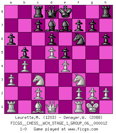 Last move : 1-0 2013 October 11 3:55:23 [Event "FICGS__CHESS__WCH_STAGE_1_GROUP_06__000012"] [Site "FICGS"] [Date "2013.07.02"] [Round "1"] [White "Leurette,Marc-Antoine"] [Black "Denayer,Will"] [Result "1-0"] [WhiteElo "1203"] [BlackElo "2088"] 1.e4 d6 2.d4 Nf6 3.Nc3 Nbd7 4.Nf3 e5 5.d5 Be7 6.Bb5 a6 7.Bxd7+ Bxd7 8.O-O h6 9.b3 b5 10.b4 Rc8 11.a3 1-0 Pirc defense Kingside Castling by player White (move 8) Player White won this chess game. Follow this game move after move (download)Every Pawn is a potential Queen. (James Mason) Der Traum, für den ich lebe, ist der von einem freien Russland. Viele mögen sagen: Russland hat doch ein Parlament, einen gewählten Präsidenten. Aber ich spüre, dass in meiner Heimat die Angst wiederkehrt. Eine Angst, sich frei zu äußern, bestimmte Dinge zu tun (Garry Kasparov) Sin errores no puede haber brillantez. (Emanuel Lasker) 'L'échange des dames est un coup dur pour les deux adversaires...' Un journaliste lors d'une partie du match Spassky-Fischer I fear not the man who has practiced 10,000 kicks once, but I fear the man who has practiced one kick 10,000 times. (Bruce Lee)
