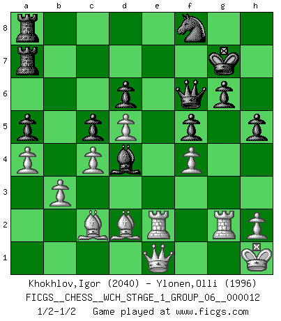 Last move : 1/2-1/2 2013 October 28 12:47:19 [Event "FICGS__CHESS__WCH_STAGE_1_GROUP_06__000012"] [Site "FICGS"] [Date "2013.07.02"] [Round "1"] [White "Khokhlov,Igor"] [Black "Ylonen,Olli"] [Result "1/2-1/2"] [WhiteElo "2040"] [BlackElo "1996"] 1.e4 c5 2.Nf3 d6 3.d4 cxd4 4.Nxd4 Nf6 5.Nc3 a6 6.Be3 e5 7.Nb3 Be6 8.f3 h5 9.Nd5 Bxd5 10.exd5 Nbd7 11.Qd2 g6 12.Be2 Qc7 13.c4 a5 14.a4 b6 15.O-O Bg7 16.Bd3 O-O 17.Rae1 Rfe8 18.Qf2 Nc5 19.Nxc5 bxc5 20.Bc2 e4 21.Kh1 exf3 22.gxf3 Nh7 23.f4 f5 24.Qg2 Qf7 25.Bd2 Reb8 26.b3 Nf8 27.Re2 Bd4 28.Qg3 Ra7 29.Qe1 Rba8 30.Rf3 Qf6 31.Rg3 Kg7 32.R3g2 1/2-1/2 Sicilian : Najdorf, Byrne (English) attack Kingside Castling by player White (move 15) Kingside Castling by player Black (move 16) This chess game ended in a draw. Follow this game move after move (download)A big shock; the best chess player in history has passed away. (Lajos Portisch, about Bobby Fischer's death) Ja, ich habe einmal eine Blitzpartie gespielt, es war in einem Zug, 1929. --im Interview 1989 (Mikhail Moiseyevich Botvinik) El Ajedrez te enseña a controlarl la excitación inicial que sientes cuando vez algo que parece bueno y te enseña a pensar objetivamente cuando te encuentras en problemas. (Stanley Kubrick) Les échecs, c'est l'art d'analyser. (Mikhail Botvinnik) The existence of forgetting has never been proved: We only know that some things don't come to mind when we want them. (Friedrich Nietzsche)