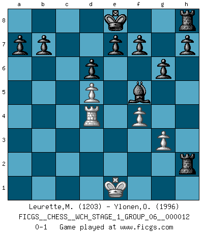 Last move : 0-1 2013 September 29 22:2:12 [Event "FICGS__CHESS__WCH_STAGE_1_GROUP_06__000012"] [Site "FICGS"] [Date "2013.07.02"] [Round "1"] [White "Leurette,Marc-Antoine"] [Black "Ylonen,Olli"] [Result "0-1"] [WhiteElo "1203"] [BlackElo "1996"] 1.e4 c5 2.Nf3 d6 3.d4 cxd4 4.Qxd4 Nc6 5.Qe3 Nf6 6.Nc3 g6 7.Nd5 Nxd5 8.exd5 Qa5+ 9.Qd2 Nb4 10.Bc4 Nxc2+ 11.Kd1 Qxd2+ 12.Bxd2 Nxa1 13.Re1 Bg7 14.b3 Bf5 15.Kc1 Nc2 16.Rd1 Rc8 17.g3 Na3 18.Nd4 Bxd4 19.f4 Nxc4 20.bxc4 Rxc4+ 21.Bc3 Rxc3+ 22.Kd2 Rc2+ 23.Ke1 Rxa2 24.Rxd4 Rxh2 0-1 Sicilian, Chekhover variation Player Black won this chess game. Follow this game move after move (download)Suddenly it was obvious to me in my analysis I had missed what Fischer had found with the greatest of ease at the board. (Mikhail Botvinnik) Die größte Kunst beim Schach besteht darin dem Gegner nicht zu zeigen was er tun kann. (Garry Kasparov) Preferería tener un Peón que un dedo. (Reuben Fine) Vous n'êtes pas toujours obligé de jouer le meilleur coup. Un coup doit être actif, entreprenant, correct et beau ! (David Bronstein) Life is pain my dear and anyone who says otherwise is selling something. (Princess Bride)