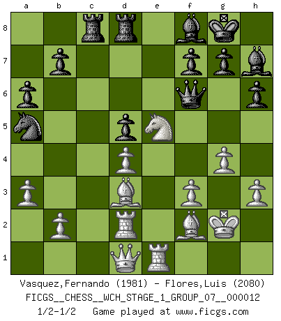 Last move : 1/2-1/2 2013 August 27 13:44:13 [Event "FICGS__CHESS__WCH_STAGE_1_GROUP_07__000012"] [Site "FICGS"] [Date "2013.07.02"] [Round "1"] [White "Vasquez,Fernando"] [Black "Flores,Luis"] [Result "1/2-1/2"] [WhiteElo "1981"] [BlackElo "2080"] 1.e4 c5 2.c3 d5 3.exd5 Qxd5 4.d4 Nf6 5.Nf3 Bg4 6.Be2 e6 7.h3 Bh5 8.O-O Nc6 9.Be3 cxd4 10.cxd4 Be7 11.Nc3 Qd6 12.Qb3 O-O 13.Rfd1 Rfd8 14.Rac1 h6 15.a3 a6 16.g3 Bf8 17.Bf4 Qe7 18.Be3 Nd5 19.Nxd5 exd5 20.Rd2 Rac8 21.Re1 Na5 22.Qd1 Qe6 23.Kg2 Bg6 24.Ne5 Be4+ 25.f3 Bf5 26.g4 Bh7 27.Bf2 Qf6 28.Bd3 1/2-1/2 Sicilian : Alapin's variation (2.c3) Kingside Castling by player White (move 8) Kingside Castling by player Black (move 12) This chess game ended in a draw. Follow this game move after move (download)Do you realize Fischer almost never has any bad pieces? He exchanges them, and the bad pieces remain with his opponents. (Yuri Balashov) Obwohl ich alt bin, darf mir niemand den Finger in den Mund stecken, sonst beisse ich. (Wilhelm Steinitz) A la fecha, Fischer esta simplemente un nivel arriba de todos los mejores jugadores de Ajedrez del mundo. (John Jacobs) Lorsque vous vous retrouvez devant une position atroce, ne tendez pas un ultime piège dérisoire avec l'intention d'abandonner si l'adversaire le déjoue ! Faites-vous plutôt un devoir de résister comme si votre vie en dépendait. Jouez le coup qui vous déplairait au centuple si vous étiez dans la peau de votre tortionnaire ! Remember : Your focus determines your reality. (Qui-Gon Jinn in Star Wars ep.1)