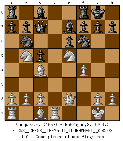 Last move : 1-0 2007 June 7 0:4:13 [Event "FICGS__CHESS__THEMATIC_TOURNAMENT__000023"] [Site "FICGS"] [Date "2007.02.01"] [Round "1"] [White "Vasquez,Fernando"] [Black "Gaffagan,Steven"] [Result "1-0"] [WhiteElo "1657"] [BlackElo "2037"] 1.e4 c5 2.f4 d5 3.Nf3 dxe4 4.Ne5 Nf6 5.Nc3 Nbd7 6.Bc4 e6 7.d3 exd3 8.Qxd3 Be7 9.O-O O-O 10.Qe2 Nb6 11.Rd1 Qc7 12.Nb5 1-0 This chess game has been lost on time (started : 2007.02.01 23:42:56) Sicilian : Grand Prix attack Kingside Castling by player White (move 9) Kingside Castling by player Black (move 9) Player White won this chess game. Follow this game move after move (download)We don't really know how the game was invented, though there are suspicions. As soon as we discover the culprits, we'll let you know. (Bruce Pandolfini) Alle offensichtlichen Züge sehen nach dem Spiel in der Analyse verdächtig aus. (Viktor Kortschnoi) Un mal plan es mejor que no tener ningún plan. (Frank Marshall) D'abord les bases : Jouez et étudiez, puis étudiez et jouez, ensuite jouez et étudiez, puis étudiez et jouez. Deuxièmement : Donnez toujours le meilleur de vous-même ! (Ken Smith) Don't be irreplaceable, if you can't be replaced, you can't be promoted. (Dan Rotaru)