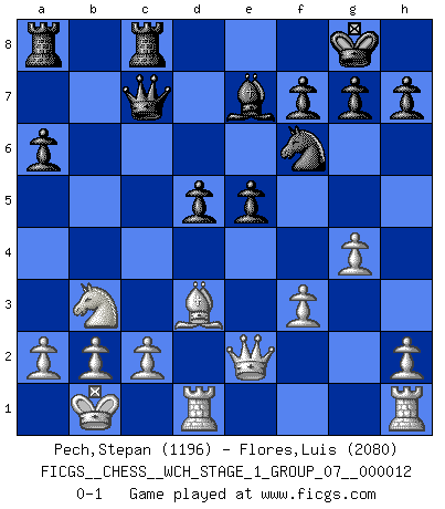 Last move : 0-1 2013 August 31 9:58:22 [Event "FICGS__CHESS__WCH_STAGE_1_GROUP_07__000012"] [Site "FICGS"] [Date "2013.07.02"] [Round "1"] [White "Pech,Stepan"] [Black "Flores,Luis"] [Result "0-1"] [WhiteElo "1196"] [BlackElo "2080"] 1.e4 c5 2.Nf3 d6 3.d4 cxd4 4.Nxd4 Nf6 5.Nc3 a6 6.Be3 e5 7.Nb3 Be6 8.f3 Be7 9.Qd2 O-O 10.O-O-O Nbd7 11.g4 b5 12.Kb1 b4 13.Nd5 Bxd5 14.exd5 Nb6 15.Qxb4 Nbxd5 16.Qd2 Nxe3 17.Qxe3 Qc7 18.Bd3 Rfc8 19.Qe2 d5 0-1 Sicilian : Najdorf, Byrne (English) attack Kingside Castling by player Black (move 9) Queenside Castling by player White (move 10) Player Black won this chess game. Follow this game move after move (download)I have never in my life played the French Defence, which is the dullest of all openings. (Wilhelm Steinitz) Das typische an einem Großmeister ist, daß er eine gewonnene Position schnell und schmerzlos gewinnt. (Irving Chernev) Yo nunca en mi vida he jugado la Defensa Francesa, que viene siendo la más aburrida de todas las Aperturas. (Wilhelm Steinitz) On entre au jeu d'Echecs comme on entre en Religion. Pour le joueur d'Echecs, la partie d'Echecs c'est l'office, la messe, le défilé du 1er Mai, le dépôt de gerbe au Monument aux Morts. C'est un drame sacré. (Michel Roos) The problem with troubleshooting is that trouble shoots back. (Anonymous)