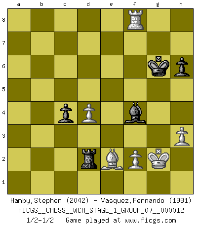 Last move : 1/2-1/2 2014 January 19 17:50:38 [Event "FICGS__CHESS__WCH_STAGE_1_GROUP_07__000012"] [Site "FICGS"] [Date "2013.07.02"] [Round "1"] [White "Hamby,Stephen"] [Black "Vasquez,Fernando"] [Result "1/2-1/2"] [WhiteElo "2042"] [BlackElo "1981"] 1.c4 e5 2.g3 Nf6 3.Bg2 Nc6 4.Nc3 Bc5 5.Nf3 d6 6.d3 h6 7.a3 a5 8.O-O O-O 9.e3 Ne7 10.Re1 c6 11.d4 exd4 12.exd4 Ba7 13.b3 Re8 14.Ra2 Bf5 15.Rae2 Qd7 16.h3 Bh7 17.Bb2 Rab8 18.Qd2 b5 19.cxb5 cxb5 20.b4 axb4 21.axb4 Bg6 22.Kh2 Rbc8 23.Nh4 Bh7 24.Bf1 Rc4 25.Nxb5 Rc2 26.Qf4 Rxe2 27.Bxe2 Bb8 28.Nc3 d5 29.Qd2 Ne4 30.Nxe4 Bxe4 31.b5 Bd6 32.Ra1 g5 33.Nf3 Bxf3 34.Bxf3 Qxb5 35.Kg2 Kg7 36.Bc1 Bb4 37.Qc2 Rc8 38.Qb1 Qc4 39.Bg4 Rb8 40.Be3 Bd6 41.Qd1 f5 42.Bh5 Qc7 43.Qd3 f4 44.gxf4 gxf4 45.Bd2 Qc4 46.Qxc4 dxc4 47.Ra7 Rb5 48.Be2 Rb2 49.Bxf4 Bxf4 50.Rxe7+ Kf6 51.Re4 Kf5 52.Re8 Rd2 53.Rf8+ Kg6 1/2-1/2 English Opening Kingside Castling by player White (move 8) Kingside Castling by player Black (move 8) This chess game ended in a draw. Follow this game move after move (download)We cannot resist the fascination of sacrifice, since a passion for sacrifices is part of a Chessplayer's nature. (Rudolf Spielman) Wenn du auf das Glück wartest, wird das Leben ziemlich langweilig. (Mikhail Nekhemyevich Tal) El Ajedrez es una manera fabulosa para que los niños aprendan a autovalorarse y a autoestimarse. (Saudin Robovic) À la honte des hommes, on sait que les lois du jeu sont les seules qui soient partout justes, claires, inviolables et exécutées. Pourquoi l'Indien qui a donné les règles du jeu d'échecs est-il obéi de bon gré dans toute la terre, et que les décrétales des papes, par exemple, sont aujourd'hui un objet d'horreur et de mépris ? C'est que l'inventeur des échecs combina tout avec justesse pour la satisfaction des joueurs, et que les papes, dans leurs décrétales, n'eurent en vue que leur seul avantage. L'Indien voulut exercer également l'esprit des hommes et leur donner du plaisir; les papes ont voulu abrutir l'esprit des hommes. Voltaire (Dictionnaire philosophique / Garnier 1967) My poor ole parrot... Is not in the circulation of displays ....poo hoo hoo :) (Wayne Lowrance's enigma)