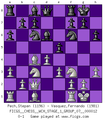 Last move : 0-1 2013 August 31 0:58:41 [Event "FICGS__CHESS__WCH_STAGE_1_GROUP_07__000012"] [Site "FICGS"] [Date "2013.07.02"] [Round "1"] [White "Pech,Stepan"] [Black "Vasquez,Fernando"] [Result "0-1"] [WhiteElo "1196"] [BlackElo "1981"] 1.d4 Nf6 2.c4 e6 3.Nf3 Nc6 4.Nc3 d5 5.e3 a6 6.a3 Be7 7.Bd3 O-O 8.O-O dxc4 9.Bxc4 Bd6 10.h3 e5 11.Qc2 h6 0-1 This chess game has been lost on time (started : 2013.07.02 19:11:48) Queen's pawn game Kingside Castling by player Black (move 7) Kingside Castling by player White (move 8) Player Black won this chess game. Follow this game move after move (download)Weak points or holes in the opponent's position must be occupied by pieces not Pawns. (Siegbert Tarrasch) Bogoljubow: Matt in vier Zügen! Tartakower: Ich verbitte mir jede Belästigung! (Savielly Grigorievitsch Tartakower) Solo puedes ser bueno en el Ajedrez si amas al juego. (Bobby Fischer) On peut tirer plus d'utilité d'une partie perdue que de 100 parties gagnées. (Capablanca) Without deviation from the norm, progress is not possible. (Frank Zappa)
