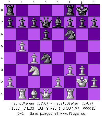 Last move : 0-1 2013 August 23 12:26:4 [Event "FICGS__CHESS__WCH_STAGE_1_GROUP_07__000012"] [Site "FICGS"] [Date "2013.07.02"] [Round "1"] [White "Pech,Stepan"] [Black "Faust,Dieter"] [Result "0-1"] [WhiteElo "1196"] [BlackElo "1787"] 1.c4 e5 2.Nc3 d6 3.g3 Be6 4.Bg2 Nc6 5.d3 Qd7 6.Rb1 Nf6 7.b4 Be7 8.b5 Nd8 9.Nf3 Bh3 10.O-O Bxg2 11.Kxg2 Ne6 12.d4 exd4 13.Nxd4 O-O 14.f3 Nxd4 0-1 This chess game has been lost on time (started : 2013.07.02 19:11:48) English, Troeger defense Kingside Castling by player White (move 10) Kingside Castling by player Black (move 13) Player Black won this chess game. Follow this game move after move (download)A good player is always lucky. (Jose Raul Capablanca) Deine Wertungszahl - vorausgesetzt einige Jahre schachliche Anstrengung - entspricht etwa dem zehnfachen Deines IQ plus 1000. (Jonathan Levitt) La pasion por jugar al Ajedrez es una de las mas inexplicables en el mundo. (H.G. Wells) Le pion, dans sa simplicité, marche droit devant lui, mais lorsqu'il prend, il le fait obliquement? Ainsi l'homme, tant qu'il reste pauvre, marche dans la droiture et vit honnêtement, mais lorsqu'il recherche les honneurs, il flatte, se parjure et, par les voies obliques, cherche une position supérieure sur l'échiquier du monde. (Jean de Galles) That's absurd. I love it. (Gregory House, House M.D.)
