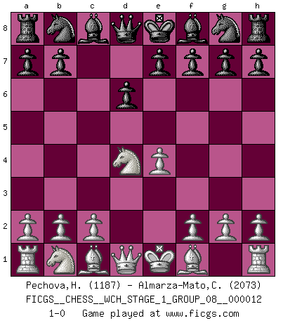 Last move : 1-0 2013 September 3 1:14:5 [Event "FICGS__CHESS__WCH_STAGE_1_GROUP_08__000012"] [Site "FICGS"] [Date "2013.07.02"] [Round "1"] [White "Pechova,Hana"] [Black "Almarza-Mato,Carlos"] [Result "1-0"] [WhiteElo "1187"] [BlackElo "2073"] 1.e4 c5 2.Nf3 d6 3.d4 cxd4 4.Nxd4 1-0 This chess game has been lost on time (started : 2013.07.02 19:13:24) Sicilian Player White won this chess game. Follow this game move after move (download)Half the variations which are calculated in a tournament game turn out to be completely superfluous. Unfortunately, no one knows in advance which half. (Jan Tinman) Im Wettkampf zwischen starken Meistern kommen Fehler sehr selten vor, deshalb ist es mit bloßem Warten nicht getan. (José Raúl Capablanca) Con el tiempo, empecé a progresar en partidas decisivas. Tal vez porque me di cuenta de una simple verdad: no solo estaba yo nervioso sino también mi oponente. (Mikhail Tal) À la honte des hommes, on sait que les lois du jeu sont les seules qui soient partout justes, claires, inviolables et exécutées. Pourquoi l'Indien qui a donné les règles du jeu d'échecs est-il obéi de bon gré dans toute la terre, et que les décrétales des papes, par exemple, sont aujourd'hui un objet d'horreur et de mépris ? C'est que l'inventeur des échecs combina tout avec justesse pour la satisfaction des joueurs, et que les papes, dans leurs décrétales, n'eurent en vue que leur seul avantage. L'Indien voulut exercer également l'esprit des hommes et leur donner du plaisir; les papes ont voulu abrutir l'esprit des hommes. Voltaire (Dictionnaire philosophique / Garnier 1967) The best teachers teach from the heart, not from the book. (Author unknown)