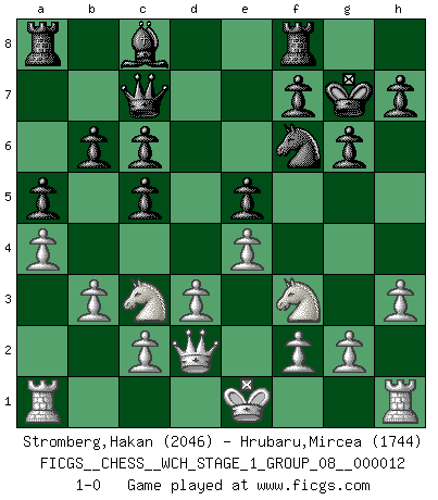 Last move : 1-0 2013 August 24 0:25:44 [Event "FICGS__CHESS__WCH_STAGE_1_GROUP_08__000012"] [Site "FICGS"] [Date "2013.07.02"] [Round "1"] [White "Stromberg,Hakan"] [Black "Hrubaru,Mircea"] [Result "1-0"] [WhiteElo "2046"] [BlackElo "1744"] 1.e4 c5 2.Nf3 Nc6 3.Bb5 g6 4.Bxc6 dxc6 5.d3 Bg7 6.h3 Nf6 7.Nc3 Qc7 8.Be3 b6 9.Qd2 e5 10.a4 a5 11.Bh6 O-O 12.Bxg7 Kxg7 13.b3 1-0 This chess game has been lost on time (started : 2013.07.02 19:13:24) Sicilian : Nimzovich-Rossolimo attack (with ...g6, without ...d6) Kingside Castling by player Black (move 11) Player White won this chess game. Follow this game move after move (download)In complicated positions, Bobby Fischer hardly had to be afraid of anybody. (Paul Keres) Das Schach hält seine Meister in eigenen Banden, Fesseln; auf vielerlei Weise formt es ihren Geist, so dass die innere Freiheit selbst des Stärksten beeinflusst wird. (Albert Einstein) Un jugador que trata de regresar una movida en el Ajedrez es un futuro carterista. (Richard Fenton) Horreur, mais aussi harmonie suprême : qu'y avait-il en effet au monde en dehors des échecs ? Le brouillard, l'inconnu, le non-être... (Vladimir Nabokov) Once you start thinking you have nothing left to learn, you have everything to learn. (Steve Badget)