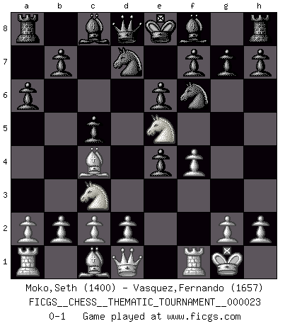 Last move : 0-1 2007 April 3 3:37:19 [Event "FICGS__CHESS__THEMATIC_TOURNAMENT__000023"] [Site "FICGS"] [Date "2007.02.01"] [Round "1"] [White "Moko,Seth"] [Black "Vasquez,Fernando"] [Result "0-1"] [WhiteElo "1400"] [BlackElo "1657"] 1.e4 c5 2.f4 d5 3.Nf3 dxe4 4.Ne5 Nf6 5.Bc4 e6 6.Nc3 a6 7.O-O Nbd7 0-1 This chess game has been lost on time (started : 2007.02.01 23:42:56) Sicilian : Grand Prix attack Kingside Castling by player White (move 7) Player Black won this chess game. Follow this game move after move (download)I feel as if I were a piece in a game of Chess, when my opponent says of it: That piece cannot be moved. (Soren Kierkegaard) Schach ist das Spiel, das die Verrückten gesund hält. (Albert Einstein) Si pudieramos observar el interior de la cabeza de un jugador de Ajedrez, encontraríamos ahí un mundo lleno de sentimientos, imágenes, ideas, emoción y pasión. (Alfred Binet) Les échecs sont un jeu par leur forme, un art par leur essence et une science par sa difficulté d'acquisition. Ils peuvent vous procurer autant de plaisir qu'un bon livre ou une belle musique, mais vous n'aurez une réelle joie que si vous arrivez à bien jouer. (Tigran Petrosian) Good decisions come from experience, and experience comes from bad decisions. (Anonymous)