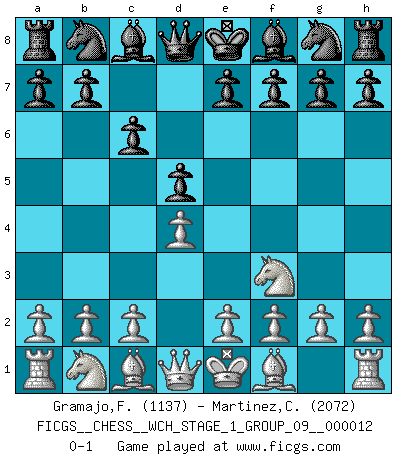 Last move : 0-1 2013 August 4 17:8:11 [Event "FICGS__CHESS__WCH_STAGE_1_GROUP_09__000012"] [Site "FICGS"] [Date "2013.07.02"] [Round "1"] [White "Gramajo,Francisco"] [Black "Martinez,Chapo"] [Result "0-1"] [WhiteElo "1137"] [BlackElo "2072"] 1.d4 d5 2.Nf3 c6 0-1 This chess game has been lost on time (started : 2013.07.02 19:15:3) Queen's pawn game Player Black won this chess game. Follow this game move after move (download)The only thing Chess players have in common is Chess. (Lodewijk Prins) Frage: Wie viele Autos haben Sie schon zerstört? - Antwort: Nur zwei. (Loek van Wely) Ciertamente, de todas la drogas del mundo, el Ajedrez debe ser el mas placentero permamentemente. (Assiac) Soyez une menace à chaque fois que vous vous asseyez pour jouer. (Ken Smith) Life is like a game of cards: the hand you are dealt represents determinism; the way you play it is free will. (Jawaharlal Nehru)