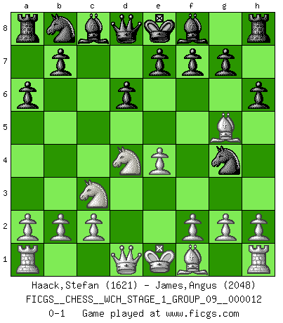 Last move : 0-1 2013 September 10 13:35:42 [Event "FICGS__CHESS__WCH_STAGE_1_GROUP_09__000012"] [Site "FICGS"] [Date "2013.07.02"] [Round "1"] [White "Haack,Stefan"] [Black "James,Angus"] [Result "0-1"] [WhiteElo "1621"] [BlackElo "2048"] 1.e4 c5 2.Nf3 d6 3.d4 cxd4 4.Nxd4 Nf6 5.Nc3 a6 6.Be3 Ng4 7.Bg5 h6 0-1 This chess game has been lost on time (started : 2013.07.02 19:15:3) Sicilian : Najdorf, Byrne (English) attack Player Black won this chess game. Follow this game move after move (download)Excellence at Chess is one mark of a scheming mind. (Sir Arthur Conan Doyle) Wenn Du nicht kämpfst, um anderen etwas zu beweisen, sondern nur für Dich selbst, dann bist du fast unbesiegbar. (Garry Kasparov) Si un gobernante no entiende al Ajedrez, ¿como puede governar él un reinado?. (El Rey Khusros II) Tous ces prétendus hommes politiques sont les pions, les Cavaliers, les Tours ou les Fous d'une partie d'échecs qui se jouera tant qu'un hasard ne renversera pas l'échiquier. (Honoré de Balzac) The ego is not master in its own house. (Sigmund Freud)