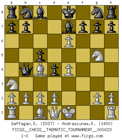 Last move : 1-0 2007 April 2 15:35:26 [Event "FICGS__CHESS__THEMATIC_TOURNAMENT__000023"] [Site "FICGS"] [Date "2007.02.01"] [Round "1"] [White "Gaffagan,Steven"] [Black "Andrasiunas,Kestutis"] [Result "1-0"] [WhiteElo "2037"] [BlackElo "1400"] 1.e4 c5 2.f4 d5 3.Nf3 d4 4.Bc4 Qa5 5.Ng5 e6 6.f5 Qb4 7.Na3 Be7 8.fxe6 1-0 This chess game has been lost on time (started : 2007.02.01 23:42:56) Sicilian : Grand Prix attack Player White won this chess game. Follow this game move after move (download)Do you realize Fischer almost never has any bad pieces? He exchanges them, and the bad pieces remain with his opponents. (Yuri Balashov) Ich habe die besten Aussichten, den ersten Preis zu gewinnen - denn jeder muss gegen Steinitz spielen, nur ich nicht! (Wilhelm Steinitz) Yo tuve un dolor de muelas en la primer partida. En el segundo juego, tuve un dolor de cabeza. En el tercero, tuve un ataque de reumatísmo. En la cuarta partida, no me sentía muy bien. ¿Y en el quinto juego? Bueno, ¿que acaso uno tiene que ganar todos los juegos?. (Siegbert Tarrasch) Toutes choses étant égales, c'est la conviction qui gagne. Alliée à une volonté de vaincre, elle sert de détonateur, suscite des idées, disperse les doutes et aide à penser clairement. (Robert Fischer) Real knowledge is to know the extent of one's ignorance. (Confucius)