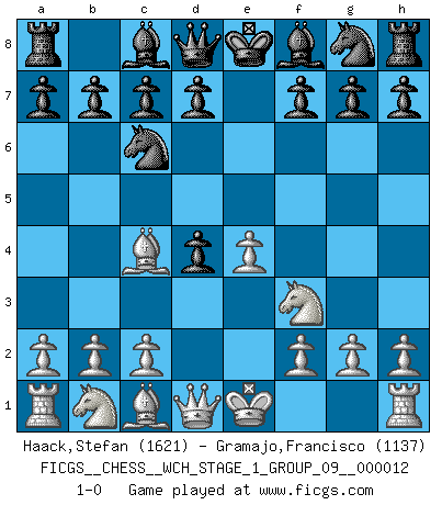 Last move : 1-0 2013 August 27 0:50:46 [Event "FICGS__CHESS__WCH_STAGE_1_GROUP_09__000012"] [Site "FICGS"] [Date "2013.07.02"] [Round "1"] [White "Haack,Stefan"] [Black "Gramajo,Francisco"] [Result "1-0"] [WhiteElo "1621"] [BlackElo "1137"] 1.e4 e5 2.Nf3 Nc6 3.d4 exd4 4.Bc4 1-0 This chess game has been lost on time (started : 2013.07.02 19:15:3) Scotch gambit Player White won this chess game. Follow this game move after move (download)Chess is a sea in which a gnat may drink and an elephant may bathe. (Hindu proverb) Sicherlich können nur Meister einen Stil haben. Daß ein nicht-Meister auch nur ein einziges Mal in seinem Leben eine Partie folgerecht durchführte, habe ich niemals bemerkt. (Emanuel Lasker) El Rey es una pieza de pelea. ¡Usenlo!. (Wilhelm Steinitz) Psychologiquement, tu dois avoir confiance en toi même, mais cette confiance doit être basée sur des faits. (Robert Fischer) No, I am still playing. (Anatoly Karpov)
