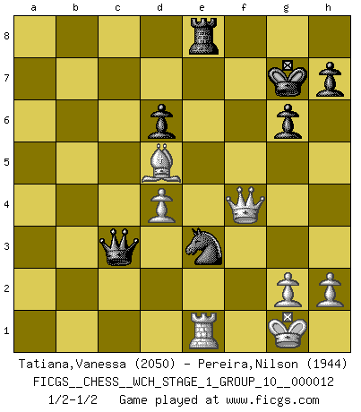 Last move : 1/2-1/2 2013 August 13 1:27:37 [Event "FICGS__CHESS__WCH_STAGE_1_GROUP_10__000012"] [Site "FICGS"] [Date "2013.07.02"] [Round "1"] [White "Tatiana,Vanessa"] [Black "Pereira,Nilson"] [Result "1/2-1/2"] [WhiteElo "2050"] [BlackElo "1944"] 1.e4 c5 2.Nf3 d6 3.d4 cxd4 4.Nxd4 Nf6 5.Nc3 a6 6.Be3 e5 7.Nb3 Be6 8.Be2 Be7 9.Qd3 O-O 10.O-O Nbd7 11.Nd5 Bxd5 12.exd5 Ne8 13.Qd2 f5 14.f4 g6 15.Qb4 exf4 16.Qxf4 Bf6 17.Nd4 Be5 18.Qh6 Ng7 19.c3 Nf6 20.Bf3 Qe7 21.Bg5 Bxd4+ 22.cxd4 Qf7 23.Rae1 Rfe8 24.Qh4 Nxd5 25.Qf2 Rac8 26.Rxe8+ Rxe8 27.Qd2 b5 28.Qa5 f4 29.Qxa6 Ne3 30.Rc1 Ne6 31.Qxb5 Nxg5 32.Qxg5 Qxa2 33.Qxf4 Qxb2 34.Re1 Qc3 35.Bd5+ Kg7 36.Qf7+ Kh6 37.Qf4+ Kg7 38.Qf7+ Kh6 39.Qf4+ Kg7 1/2-1/2 Sicilian : Najdorf, Byrne (English) attack Kingside Castling by player Black (move 9) Kingside Castling by player White (move 10) This chess game ended in a draw. Follow this game move after move (download)Chess is like war on a board. (Bobby Fischer) Es gibt nur zwei wahre Schachgenies - das andere war Wilhelm Steinitz, der Weltmeister von 1872 bis 1894. (Robert James Fischer) El ganar no lo es todo... pero el perder es nada. (Mednis) Le plus grand jeu de l'esprit jamais inventé, plus vous l'apprenez, plus vous y prenez du plaisir. (Garry Kasparov) When the going gets tactical, the computers get going. (Hyatt)