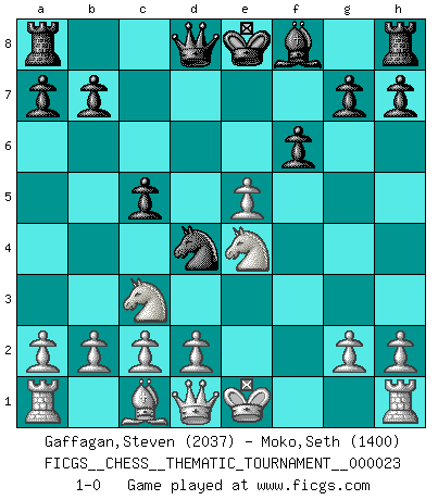 Last move : 1-0 2007 April 18 11:31:34 [Event "FICGS__CHESS__THEMATIC_TOURNAMENT__000023"] [Site "FICGS"] [Date "2007.02.01"] [Round "1"] [White "Gaffagan,Steven"] [Black "Moko,Seth"] [Result "1-0"] [WhiteElo "2037"] [BlackElo "1400"] 1.e4 c5 2.f4 d5 3.Nf3 dxe4 4.Ng5 Nf6 5.Nc3 Bg4 6.Be2 Nc6 7.Bxg4 Nxg4 8.Qxg4 Nd4 9.Qd1 f6 10.Ngxe4 e5 11.fxe5 1-0 Sicilian : Grand Prix attack Player White won this chess game. Follow this game move after move (download)The battle for the ultimate truth will never be won. And that's why Chess is so fascinating. (Hans Kmoch) Die starken Figuren des Gegners muss man abtauschen. (José Raúl Capablanca) Fischer es una tragedia del Ajedrez Americano a la par con Morphy y Pillsbury. (Mig Greengard) Si rien de grave n'est détecté lors de l'analyse d'une position, on joue alors le coup. Seconde règle de Blumenfeld. Even the best needles are not sharp at both ends. (Chinese proverb)