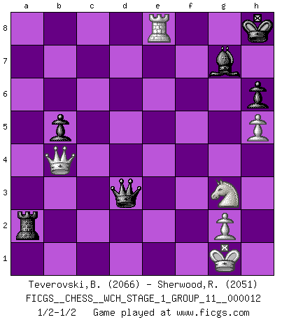 Last move : 1/2-1/2 2013 September 6 0:56:27 [Event "FICGS__CHESS__WCH_STAGE_1_GROUP_11__000012"] [Site "FICGS"] [Date "2013.07.02"] [Round "1"] [White "Teverovski,Bogoljub"] [Black "Sherwood,Russell"] [Result "1/2-1/2"] [WhiteElo "2066"] [BlackElo "2051"] 1.d4 Nf6 2.c4 g6 3.Nc3 d5 4.Nf3 Bg7 5.Qb3 dxc4 6.Qxc4 O-O 7.e4 a6 8.Qb3 b5 9.e5 Nfd7 10.Be2 c5 11.e6 cxd4 12.exf7+ Kh8 13.Ne4 Nc6 14.h4 h6 15.h5 g5 16.Bxg5 Nde5 17.Bf4 Nxf7 18.O-O Nfe5 19.Bxe5 Nxe5 20.Nxe5 Bxe5 21.Bf3 Ra7 22.Rfe1 Rc7 23.Rac1 Bf5 24.Qa3 a5 25.b4 Rxc1 26.Qxc1 Bg7 27.Qd2 axb4 28.Qxb4 Qd7 29.Ng3 Be6 30.Be2 d3 31.Bxd3 Qxd3 32.Rxe6 Rxf2 33.Rxe7 Rxa2 34.Re8+ 1/2-1/2 King's Indian defense, 3.Nc3 Kingside Castling by player Black (move 6) Kingside Castling by player White (move 18) This chess game ended in a draw. Follow this game move after move (download)The hallmark of the artist is simplicity. (Larry Evans) Mein erstes Ziel war nicht, die Partie zu gewinnen, sondern eine Figur zu opfern. -- der junge (Wilhelm Steinitz) No hay otro maestro que tenga una voluntad terrífica de ganar. Al tablero, el irradía peligro y aún los oponentes mas fuertes tienden a congelarse como liebres cuando olfatean a una pantera. Aún sus debilidades son peligrosas. Con las blancas, su juego de apertura es predecible - te es posible hacer planes en su contra - pero es tan fuerte que tus planes casi nunca funcionan. En el juego medio, su precisión e invención son fabulosas y en finales, tú simplemente no le puedes vencer. (Experto Alemán anónimo) On croit qu'il y a plus de mauvais joueurs que de bons joueurs, c'est faux : Il y a autant de joueurs qui gagnent que de joueurs qui perdent. (Philippe Geluck) Strategy without tactics is the slowest route to victory. Tactics without strategy is the noise before defeat. (Sun Tzu)