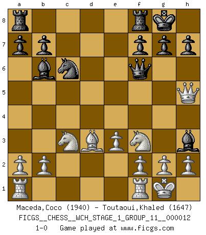 Last move : 1-0 2013 September 9 13:29:56 [Event "FICGS__CHESS__WCH_STAGE_1_GROUP_11__000012"] [Site "FICGS"] [Date "2013.07.02"] [Round "1"] [White "Maceda,Coco"] [Black "Toutaoui,Khaled"] [Result "1-0"] [WhiteElo "1940"] [BlackElo "1647"] 1.d4 d5 2.c4 e6 3.Nc3 Nf6 4.Bg5 Be7 5.e3 O-O 6.Nf3 c5 7.dxc5 Bxc5 8.cxd5 exd5 9.Bxf6 Qxf6 10.Qxd5 Bb6 11.Bd3 Nc6 12.O-O Be6 13.Qb5 Bh3 14.Qh5 1-0 This chess game has been lost on time (started : 2013.07.02 19:19:0) QGD : 6.Nf3 Kingside Castling by player Black (move 5) Kingside Castling by player White (move 12) Player White won this chess game. Follow this game move after move (download)When I have White, I win because I am white; When I have Black, I win because I am Bogolyubov. (Bogolyubov) Der Traum, für den ich lebe, ist der von einem freien Russland. Viele mögen sagen: Russland hat doch ein Parlament, einen gewählten Präsidenten. Aber ich spüre, dass in meiner Heimat die Angst wiederkehrt. Eine Angst, sich frei zu äußern, bestimmte Dinge zu tun (Garry Kasparov) Cuando estes solo, cuando te sientas un extraño en el mundo, juega al Ajedrez. Esto levantará tu espiritu y será tu consejero de guerra. (Aristóteles) Un journaliste : 'Vous préférez avoir une dame de plus sur l'échiquier ou au lit ?' Boris Spassky : 'Ca dépend de la position.' A clear conscience is usually the sign of a bad memory. (Unknown)
