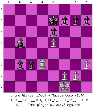 Last move : 0-1 2013 August 30 6:28:27 [Event "FICGS__CHESS__WCH_STAGE_1_GROUP_11__000012"] [Site "FICGS"] [Date "2013.07.02"] [Round "1"] [White "Bromo,Alexis"] [Black "Maceda,Coco"] [Result "0-1"] [WhiteElo "1085"] [BlackElo "1940"] 1.d4 d5 2.c4 dxc4 3.Nc3 a6 4.e4 b5 5.Nf3 Bb7 6.b4 Nf6 7.e5 Nd5 8.Nxd5 Qxd5 9.Be2 e6 10.O-O Bxb4 11.a3 Bc3 12.Rb1 c5 13.Be3 cxd4 14.Bxd4 Bxd4 15.Qxd4 Qxd4 16.Nxd4 Nc6 17.Nxc6 Bxc6 18.Rfd1 Ke7 19.a4 Rad8 20.axb5 Rxd1+ 21.Rxd1 axb5 22.Ra1 Rd8 23.h3 c3 24.Bd1 Rxd1+ 25.Rxd1 b4 26.Kf1 b3 27.Rd3 Bb5 0-1 Queen's gambit accepted Kingside Castling by player White (move 10) Player Black won this chess game. Follow this game move after move (download)A man without frontiers. He didn't divide the East and the West, he brought them together in their admiration for him. (Ljubomir Ljubojevic, about Bobby Fischer's death) Karpov ist ein Museumsstück. (Garry Kasparov) El tablero es el mundo, las piezas es el fenomeno del universo, las reglas del juego son lo que llamamos leyes de la naturaleza y el jugador del lado opuesto, se encuentra oculto a nuestra vista. (Thomas Huxley) Les échecs, c'est l'art d'analyser. (Mikhail Botvinnik) Chess, like love, like music, has the power to make people happy. (Siegbert Tarrasch)