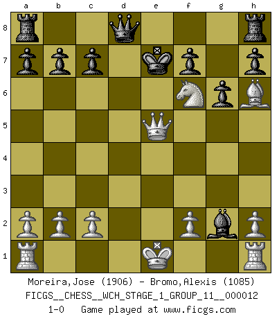 Last move : 1-0 2013 July 11 21:1:32 [Event "FICGS__CHESS__WCH_STAGE_1_GROUP_11__000012"] [Site "FICGS"] [Date "2013.07.02"] [Round "1"] [White "Moreira,Jose"] [Black "Bromo,Alexis"] [Result "1-0"] [WhiteElo "1906"] [BlackElo "1085"] 1.e4 e5 2.Nf3 Nc6 3.Bb5 d6 4.d4 Bd7 5.Bxc6 Bxc6 6.Nc3 Nf6 7.Qd3 g6 8.dxe5 dxe5 9.Nxe5 Bb4 10.Qc4 Bxc3+ 11.Qxc3 Bxe4 12.Ng4 Bxg2 13.Nxf6+ Kf8 14.Bh6+ Ke7 15.Qe5+ 1-0 Ruy Lopez : Old Steinitz defense Player White won this chess game. Follow this game move after move (download)The way he plays Chess demonstrates a man's whole nature. (Stanley Ellin) In der Schule lernt man nichts. Es ist nur Zeitverschwendung. (Robert James Fischer) Un mal plan es mejor que no tener ningún plan. (Frank Marshall) On n'a jamais que l'âge auquel on a commence à jouer aux échecs car après on cesse de vieillir. (Capablanca) Nowadays, anyone who cannot speak English and is incapable of using the Internet is regarded as backward. (Al-Waleed bin Talal)