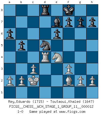 Last move : 1-0 2013 September 7 13:25:12 [Event "FICGS__CHESS__WCH_STAGE_1_GROUP_11__000012"] [Site "FICGS"] [Date "2013.07.02"] [Round "1"] [White "Rey,Eduardo"] [Black "Toutaoui,Khaled"] [Result "1-0"] [WhiteElo "1715"] [BlackElo "1647"] 1.e4 c5 2.Nf3 Nc6 3.d4 cxd4 4.Nxd4 d6 5.Nc3 Nf6 6.f3 e6 7.Be3 Be7 8.Qd2 O-O 9.O-O-O d5 10.exd5 Nxd5 11.Nxd5 Qxd5 12.Kb1 Nb4 13.Nb3 Rd8 14.Bc4 Qxd2 15.Rxd2 b6 16.Rxd8+ Bxd8 17.Rd1 Bb7 18.Nd4 Bf6 19.Nb5 a6 20.Nd6 Bd5 21.Bxd5 Nxd5 22.Bf2 b5 23.Ne4 Be7 24.Rd4 Rd8 25.c3 Kf8 26.Kc2 1-0 This chess game has been lost on time (started : 2013.07.02 19:19:0) Sicilian defense Kingside Castling by player Black (move 8) Queenside Castling by player White (move 9) Player White won this chess game. Follow this game move after move (download)He who takes the Queen's Knight's Pawn will sleep in the streets. (Anonymous) Schach ist ein Kampf gegen den Fehler. (Johannes Herrman Zukertort) Tu no necesitas jugar muy bien, únicamente ayudar a tu oponenet a que juegue muy mal. (Genrikh Chepukaitis) Je ne crois pas en la psychologie, je crois aux bons coups. (Robert Fischer) Never risk one's whole fortune unless supported by one's entire army. (Niccolo Machiavelli)