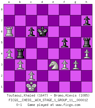 Last move : 0-1 2013 September 12 1:47:36 [Event "FICGS__CHESS__WCH_STAGE_1_GROUP_11__000012"] [Site "FICGS"] [Date "2013.07.02"] [Round "1"] [White "Toutaoui,Khaled"] [Black "Bromo,Alexis"] [Result "0-1"] [WhiteElo "1647"] [BlackElo "1085"] 1.e4 e5 2.Nf3 Nc6 3.d4 d6 4.dxe5 dxe5 5.Qxd8+ Kxd8 6.Bb5 Nf6 7.Bg5 Be7 8.Bxc6 bxc6 9.Nxe5 Be6 10.Nxc6+ Ke8 11.Nxe7 Kxe7 12.e5 Rhd8 13.exf6+ gxf6 14.Bh4 Rd4 15.Nc3 Rxh4 16.O-O-O Rc4 17.Rd3 Kf8 18.Rhd1 Rg4 19.g3 Rb4 20.Rf3 Bg4 21.Rxf6 Bxd1 22.Nxd1 Rab8 23.b3 a5 24.Ra6 R8b5 25.Ne3 Ke7 26.a4 Rh5 27.h4 f5 28.Rxa5 Ke6 29.f3 c6 30.Ra6 Kd6 0-1 This chess game has been lost on time (started : 2013.07.02 19:19:0) Scotch Opening Queenside Castling by player White (move 16) Player Black won this chess game. Follow this game move after move (download)When in doubt... play Chess ! (Tevis) Zu meiner Zeit war ein 20 jähriger ein junger Spieler, heute ist er ein Veteran. (Garry Kasparov) Las Aperturas te enseñan aperturas. ¡Los Finales te enseñan Ajedrez!. (Stephan Gerzadowicz) La vérité est comme le meilleur coup aux échecs : elle existe, mais il faut la chercher. (Arturo Perez-Reverte) Life is the sum of all your choices. (Albert Camus)
