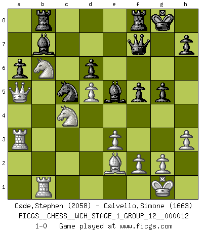 Last move : 1-0 2013 September 16 13:57:23 [Event "FICGS__CHESS__WCH_STAGE_1_GROUP_12__000012"] [Site "FICGS"] [Date "2013.07.02"] [Round "1"] [White "Cade,Stephen"] [Black "Calvello,Simone"] [Result "1-0"] [WhiteElo "2058"] [BlackElo "1663"] 1.d4 Nf6 2.c4 e6 3.Nf3 c5 4.d5 exd5 5.cxd5 d6 6.Nc3 g6 7.Bf4 a6 8.a4 Bg7 9.h3 O-O 10.e3 Ne8 11.Be2 Nd7 12.O-O Qe7 13.Nd2 Ne5 14.a5 Rb8 15.Qb3 Nf6 16.Qa3 Nfd7 17.b4 cxb4 18.Qxb4 b5 19.axb6 Rxb6 20.Qa5 f5 21.Na4 Rb8 22.Rfb1 Bb7 23.Ra3 g5 24.Bh2 Qf7 25.Nb6 Nc5 26.Bxe5 Bxe5 27.Ndc4 1-0 This chess game has been lost on time (started : 2013.07.02 19:21:12) Queen's pawn game Kingside Castling by player Black (move 9) Kingside Castling by player White (move 12) Player White won this chess game. Follow this game move after move (download)Suddenly it was obvious to me in my analysis I had missed what Fischer had found with the greatest of ease at the board. (Mikhail Botvinnik) Der Knackpunkt bei der Konzentration ist, daß wir nur durch sie etwas Neues und Ungewöhnliches am Schachbrett finden können. Sie ist der einzige Weg durch neue neue Ideen eine Überraschung zu bereiten. (Garry Kasparov) Una compensación adecuada por un sacrificio es tener una combinación sólida que conduce a una posición ganadora; una compensación adecuada por una metida de pata es dejar a tu oponente arrebatar una derrota de las fauces de la victoria. (Bruce A. Moon) La tactique est l'élément le plus important du milieu de jeu. (Siegbert Tarrasch) First of all, we have to go back to the classical time control. (Anatoly Karpov)