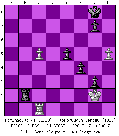 Last move : 0-1 2014 January 6 1:50:25 [Event "FICGS__CHESS__WCH_STAGE_1_GROUP_12__000012"] [Site "FICGS"] [Date "2013.07.02"] [Round "1"] [White "Domingo,Jordi"] [Black "Kokoryukin,Sergey"] [Result "0-1"] [WhiteElo "1920"] [BlackElo "1920"] 1.e4 c5 2.Nf3 d6 3.d4 cxd4 4.Nxd4 Nf6 5.Nc3 a6 6.Be3 e6 7.f3 b5 8.g4 h6 9.Qd2 b4 10.Na4 Nbd7 11.O-O-O Ne5 12.b3 Bd7 13.Nb2 d5 14.Bf4 Ng6 15.Bg3 dxe4 16.Nc4 Nd5 17.h4 Bc5 18.h5 Nge7 19.fxe4 Nc3 20.Bd6 Nxe4 21.Qf4 Nxd6 22.Nxd6+ Bxd6 23.Qxd6 O-O 24.Qxb4 a5 25.Qd6 Nd5 26.Kb2 a4 27.Bg2 Re8 28.Rhe1 a3+ 29.Ka1 Qa5 30.Qg3 Rad8 31.c4 Nf4 32.Be4 f5 33.Bc6 Bxc6 34.Nxc6 Rxd1+ 35.Rxd1 Qc7 36.g5 Qxc6 37.Qxf4 Qg2 38.Qc1 hxg5 39.Qxa3 Ra8 40.Qb2 Qxb2+ 41.Kxb2 f4 42.Kc2 g4 43.Rf1 e5 44.Kd3 g3 45.Ke4 Rxa2 46.c5 Re2+ 47.Kf3 Re3+ 48.Kg2 Rxb3 49.Rc1 Rb2+ 0-1 Sicilian : Najdorf, Byrne (English) attack Queenside Castling by player White (move 11) Kingside Castling by player Black (move 23) 10 pieces endgame at move 48 : White KRPP , Black KRPPPP WHITE : King + 1 Rook 2 Pawns BLACK : King + 1 Rook 4 Pawns Player Black won this chess game. Follow this game move after move (download)Chess is a terrible game. If you have no center, your opponent has a freer position. If you do have a center, then you really have something to worry about ! (Siegbert Tarrasch) Ich würde die 30 stärksten Spieler der USA im Simultanspiel besiegen. (José Raúl Capablanca) Un mal plan es mejor que no tener ningún plan. (Frank Marshall) Le temps de noter son nom sur la feuille de partie, j'étais déjà en zeitnot ! D'un modeste amateur apparié lors de la première ronde d'un open contre le grand-maître Azmaïparashvili. A computer lets you make more mistakes faster than any invention in human history - with the possible exceptions of handguns and tequila. (Mitch Ratcliffe)