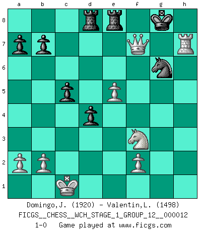 Last move : 1-0 2013 October 3 16:33:35 [Event "FICGS__CHESS__WCH_STAGE_1_GROUP_12__000012"] [Site "FICGS"] [Date "2013.07.29"] [Round "1"] [White "Domingo,Jordi"] [Black "Valentin,Laurentiu"] [Result "1-0"] [WhiteElo "1920"] [BlackElo "1498"] 1.g4 g5 2.h4 gxh4 3.d4 Bg7 4.e4 Nf6 5.e5 Nd5 6.c4 Nb6 7.c5 Nd5 8.Bc4 e6 9.Nf3 Nc6 10.Bxd5 exd5 11.Nc3 Ne7 12.Bg5 O-O 13.Nxd5 Re8 14.Nf6+ Bxf6 15.Bxf6 d6 16.Qd2 Bxg4 17.Qg5+ Ng6 18.Bxd8 Raxd8 19.Qxg4 dxc5 20.O-O-O cxd4 21.Rxh4 c5 22.Rdh1 Kf8 23.Rxh7 Ke7 24.Rxf7+ Kxf7 25.Rh7+ Kf8 26.Qf5+ Kg8 27.Qf7+ 1-0 Grob's attack Kingside Castling by player Black (move 12) Queenside Castling by player White (move 20) Player White won this chess game. Follow this game move after move (download)Chess is the art of analysis. (Mikhail Botvinnik) Es genügt nicht ein guter Spieler zu sein, man muß auch gut spielen. (Siegbert Tarrasch) El Ajedrez es un invernadero donde los frutos del carácter pueden madurar mas completamente que en la vida. (Edward Morgan Foster) J'ai toujours senti une vague pitié pour l'homme qui ne connaît rien aux échecs, tout comme j'en aurais pour un homme ignorant de l'amour. Les Echecs, comme la musique ou comme l'amour, ont le pouvoir de rendre heureux. (Siegbert Tarrasch) Cactus - It is depressed cucumber. (Ilmars Cirulis)