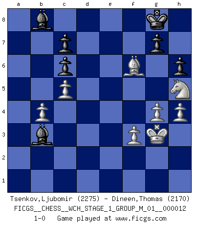 Last move : 1-0 2013 August 26 3:48:43 [Event "FICGS__CHESS__WCH_STAGE_1_GROUP_M_01__000012"] [Site "FICGS"] [Date "2013.07.02"] [Round "1"] [White "Tsenkov,Ljubomir"] [Black "Dineen,Thomas"] [Result "1-0"] [WhiteElo "2275"] [BlackElo "2170"] 1.c4 e5 2.g3 Nf6 3.Bg2 Nc6 4.Nc3 Bc5 5.e3 O-O 6.a3 d6 7.b4 Bb6 8.Bb2 h6 9.Nge2 Bf5 10.d4 exd4 11.exd4 a6 12.O-O Re8 13.c5 Ba7 14.Nf4 Qd7 15.Ncd5 Nxd5 16.Bxd5 Be4 17.Bb3 Rad8 18.Ba4 dxc5 19.dxc5 Qxd1 20.Raxd1 Rxd1 21.Bxd1 Kf8 22.f3 Bh7 23.Ba4 Rd8 24.Bxc6 bxc6 25.Re1 Bc2 26.Bc3 a5 27.Kg2 Bb3 28.h4 axb4 29.axb4 Rd1 30.Rxd1 Bxd1 31.g4 Bb3 32.Kg3 Kg8 33.Be5 Bb8 34.Nh5 f6 35.Bxf6 1-0 English Opening Kingside Castling by player Black (move 5) Kingside Castling by player White (move 12) Player White won this chess game. Follow this game move after move (download)It is peculiar but a fact nevertheless, that gamblers in chess always have enthusiastic followers. (Botvinnik) Die FIDE ist dabei in die Hände der russischen Mafia zu fallen. (Larry Evans) Por esta medida (el intervalo entre Fischer y sus contemporaneos), yo le considero el mas grande campeón mundial. (Garry Kasparov) Nous vivons dans un monde échiquéen : chaque jour qui passe est un défi à relever. (Philosophe Sasha) I teach you to lie, cheat and steal, and as soon as my back's turned you wait in line ? (Gregory House, House M.D.)