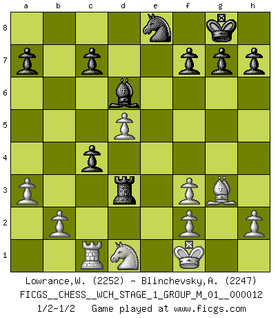 Last move : 1/2-1/2 2013 September 19 9:58:8 [Event "FICGS__CHESS__WCH_STAGE_1_GROUP_M_01__000012"] [Site "FICGS"] [Date "2013.07.02"] [Round "1"] [White "Lowrance,Wayne"] [Black "Blinchevsky,Alexander"] [Result "1/2-1/2"] [WhiteElo "2252"] [BlackElo "2247"] 1.e4 e5 2.Nf3 Nf6 3.Nxe5 d6 4.Nf3 Nxe4 5.d4 d5 6.Bd3 Nc6 7.O-O Be7 8.c4 Nb4 9.a3 Nxd3 10.Qxd3 Bf5 11.Qb3 dxc4 12.Qxb7 O-O 13.Qc6 Nd6 14.Nc3 Re8 15.Re1 Rb8 16.Qa6 Rb7 17.Na4 Qa8 18.Qc6 Bf8 19.Bf4 Be4 20.d5 R7b8 21.Qxa8 Rxa8 22.Nc3 Bxf3 23.gxf3 Rab8 24.Rxe8 Nxe8 25.Nd1 Rb3 26.Rc1 Rd3 27.Kf1 Bd6 28.Bg3 1/2-1/2 Petrov : Classical attack Kingside Castling by player White (move 7) Kingside Castling by player Black (move 12) This chess game ended in a draw. Follow this game move after move (download)Botvinnik tried to take the mystery out of Chess, always relating it to situations in ordinary life. He used to call Chess a typical inexact problem similar to those which people are always having to solve in everyday life. (Garry Kasparov) Wenn Du absolut nicht mehr weißt, was Du tun sollst, dann ist es Zeit für Panik. (John van der Wiel) Aquel que teme a un Peón de Reina aislado, debería de retirarse del Ajedrez. (Siegbert Tarrasch) Les réformistes prétendent que les progrès de la théorie conduiront à la disparition des échecs, et qu'il faut, pour leur rendre vie, en remanier les règles. En réalité, qu'exprime cette affirmation? Le mépris de l'intuition, de l'imagination et de tous les autres éléments qui font des échecs un art. (Alexander Alekhine) There is a great deal of difference between an eager man who wants to read a book and a tired man who wants a book to read. (G.K. Chesterton)