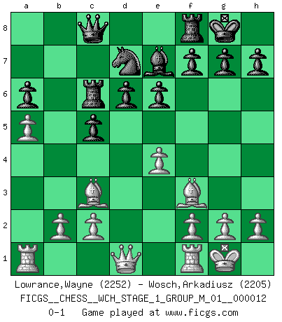 Last move : 0-1 2013 October 8 3:28:29 [Event "FICGS__CHESS__WCH_STAGE_1_GROUP_M_01__000012"] [Site "FICGS"] [Date "2013.07.02"] [Round "1"] [White "Lowrance,Wayne"] [Black "Wosch,Arkadiusz"] [Result "0-1"] [WhiteElo "2252"] [BlackElo "2205"] 1.e4 c5 2.Nf3 Nc6 3.Nc3 e6 4.d4 cxd4 5.Nxd4 Qc7 6.Be2 a6 7.O-O Nf6 8.Be3 Bb4 9.Na4 Be7 10.Nxc6 bxc6 11.Nb6 Rb8 12.Nxc8 Qxc8 13.Bd4 c5 14.Be5 Rb6 15.Bf3 O-O 16.a4 d6 17.Bc3 Nd7 18.a5 Rc6 0-1 This chess game has been lost on time (started : 2013.07.02 19:23:20) Sicilian defense Kingside Castling by player White (move 7) Kingside Castling by player Black (move 15) Player Black won this chess game. Follow this game move after move (download)A thorough understanding of the typical mating continuations makes the most complicated sacrificial combinations leading up to them not only not difficult, but almost a matter of course. (Siegbert Tarrasch) Jeder weiß, dass Gasprom Putins persönliches Machtinstrument ist. Die Firma wird vom Kreml aus geleitet und wird schon deshalb nie transparent sein. (Garry Kasparov) Los finales de Peón son del Ajedrez lo que el cesped es del Golf. (Cecil Purdy) Ne tendez aucun piège pour le plaisir ! Ne jouez rien dans l'espoir que l'adversaire réagisse de façon stupide ! Prenez toujours pour acquis que l'adversaire va trouver le meilleur coup ! Ne jouez jamais de coup dans l'espoir que l'adversaire ne voie pas la menace ! Chacun de vos coups doit améliorer la position d'une façon ou d'une autre. However beautiful the strategy, you should occasionally look at the results. (Winston Churchill)