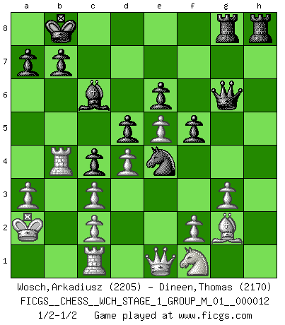 Last move : 1/2-1/2 2013 October 9 18:1:33 [Event "FICGS__CHESS__WCH_STAGE_1_GROUP_M_01__000012"] [Site "FICGS"] [Date "2013.07.02"] [Round "1"] [White "Wosch,Arkadiusz"] [Black "Dineen,Thomas"] [Result "1/2-1/2"] [WhiteElo "2205"] [BlackElo "2170"] 1.e4 e6 2.d4 d5 3.Nc3 Nf6 4.Bg5 Bb4 5.e5 h6 6.Bd2 Bxc3 7.bxc3 Ne4 8.Qg4 g6 9.Bd3 Nxd2 10.Kxd2 c5 11.Nf3 c4 12.Be2 Qa5 13.h4 Nd7 14.a3 Nb6 15.Rhb1 Bd7 16.h5 O-O-O 17.hxg6 Rdg8 18.g7 Rh7 19.g3 Rhxg7 20.Qh4 Bc6 21.Nh2 Nd7 22.Qxh6 Rg6 23.Qe3 Nc5 24.Bf3 Rh8 25.Nf1 f6 26.Bg2 f5 27.Rb4 Ne4+ 28.Kc1 Qd8 29.Qe1 Kb8 30.Kb1 Rg7 31.Ka2 Qf8 32.Rd1 Qf7 33.Rdb1 R7g8 34.Ra1 Qg6 35.Rc1 1/2-1/2 French : MacCutcheon, Lasker variation Queenside Castling by player Black (move 16) This chess game ended in a draw. Follow this game move after move (download)I'd rather have a Pawn than a finger. (Reuben Fine) Ich verlor meine Bürgerrechte, mein Gehalt wurde mir nicht mehr bezahlt und ich wurde zensiert und durfte nicht mehr ins Ausland reisen. [nach dem Match Fischer-Taimanov 6:0] (Mark Taimanov) Yo considero que Fischer es uno de los expertos mas grandes de aperturas de siempre. (Keith Hayward) La vie est comme un jeu d'échecs : nous esquissons un plan, mais celui-ci est tributaire de ce que daignent faire l'adversaire aux échecs et le destin dans la vie. (Arthur Schopenhauer) The best weapon against an enemy is another enemy. (Friedrich Nietzsche)