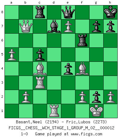 Last move : 1-0 2013 November 4 18:0:12 [Event "FICGS__CHESS__WCH_STAGE_1_GROUP_M_02__000012"] [Site "FICGS"] [Date "2013.07.02"] [Round "1"] [White "Basant,Neel"] [Black "Fric,Lubos"] [Result "1-0"] [WhiteElo "2194"] [BlackElo "2273"] 1.e4 c5 2.Nf3 d6 3.d4 cxd4 4.Nxd4 Nf6 5.Nc3 a6 6.Be3 e5 7.Nb3 Be6 8.Be2 Be7 9.O-O O-O 10.Qd3 Nc6 11.a3 Na5 12.Nd5 Nxd5 13.exd5 Bd7 14.a4 f5 15.Nxa5 Qxa5 16.Qb3 Qc7 17.Bb6 Qc8 18.c4 Be8 19.Rfd1 Kh8 20.a5 Bd7 21.Qb4 Rf6 22.Ra3 Rh6 23.Rc3 Qe8 24.Bc7 e4 25.Qxb7 f4 26.c5 f3 27.Bxa6 dxc5 28.Bc4 Rc8 29.Bf4 Rf6 30.d6 fxg2 31.dxe7 1-0 This chess game has been lost on time (started : 2013.07.02 19:24:32) Sicilian : Najdorf, Byrne (English) attack Kingside Castling by player White (move 9) Kingside Castling by player Black (move 9) Player White won this chess game. Follow this game move after move (download)By playing at Chess then, we may learn: First: Foresight... Second: Circumspection... Third: Caution... And lastly, we learn by Chess the habit of not being discouraged by present bad appearances in the state of our affairs, the habit of hoping for a favorable chance, and that of persevering in the secrets of resources. (Benjamin Franklin) Schach ist ein schwarz-weisser Dschungel. (Garry Kasparov) El ganador de una partida es aquel jugador que hace el penúltimo error. (Savielly Tartakover) Les ravages du H expliquent la différence de niveau entre Tal et Thal [Abergel]. Difficult things take a long time, impossible things a little longer. (Author unknown)