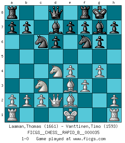 Last move : 1-0 2007 March 21 13:43:33 [Event "FICGS__CHESS__RAPID_B__000035"] [Site "FICGS"] [Date "2007.02.04"] [Round "1"] [White "Laaman,Thomas"] [Black "Vanttinen,Timo"] [Result "1-0"] [WhiteElo "1661"] [BlackElo "1593"] 1.e4 c5 2.Nf3 d6 3.d4 cxd4 4.Nxd4 Nf6 5.Nc3 g6 6.Be3 Bg7 7.f3 Nc6 8.Qd2 Bd7 9.Be2 O-O 10.g4 1-0 This chess game has been lost on time (started : 2007.02.04 8:52:41) Sicilian : Dragon, Yugoslav attack Kingside Castling by player Black (move 9) Player White won this chess game. Follow this game move after move (download)Fischer wanted to give the Russians a taste of their own medicine. (Larry Evans) Konzentriere dich auf materielle Gewinne. Nimm, was dir dein Gegner gibt, ausser es gibt einen guten Grund der dagegenspricht. (Robert James Fischer) Combinaciones deslumbrantes son para la mayoría, mover madera es para los pocos. (Georg Kieninger) L'attaque fait le spectacle, la défense gagne les matchs. (Dicton footballistique) History is a gallery of pictures in which there are few originals and many copies. (Alexis de Tocqueville)