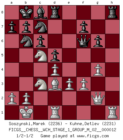 Last move : 1/2-1/2 2013 August 13 10:32:14 [Event "FICGS__CHESS__WCH_STAGE_1_GROUP_M_02__000012"] [Site "FICGS"] [Date "2013.07.02"] [Round "1"] [White "Soszynski,Marek"] [Black "Kuhne,Detlev"] [Result "1/2-1/2"] [WhiteElo "2236"] [BlackElo "2231"] 1.d4 d5 2.c4 e6 3.Nc3 Nf6 4.cxd5 exd5 5.Bg5 c6 6.Qc2 Be7 7.e3 Nbd7 8.Nf3 Nh5 9.Bxe7 Qxe7 10.O-O-O Nb6 11.h3 g6 12.Bd3 Nf6 13.Kb1 Be6 14.Nd2 O-O-O 15.f3 Kb8 16.Nb3 Ne8 17.Rhe1 Nc7 18.Nc5 Rhe8 19.Qf2 Qf6 20.g4 h5 21.Rg1 hxg4 22.hxg4 Rh8 23.Qg2 Bc8 24.Rh1 1/2-1/2 QGD : Exchange, positional line, 6.Qc2 Queenside Castling by player White (move 10) Queenside Castling by player Black (move 14) This chess game ended in a draw. Follow this game move after move (download)Chess is like life. (Boris Spassky) Es tut gut, die Entwicklungsperiode von, [...] demokratischem Geist durchdringen zu lassen. Wie undemokratisch wäre es doch beispielsweise, den einen Offizier große Spaziertouren vornehmen zu lassen, während die anderen zu Hause säßen und sich entsetzlich langweilten. (Aaron Nimzowitsch) El Ajedrez te enseña a controlarl la excitación inicial que sientes cuando vez algo que parece bueno y te enseña a pensar objetivamente cuando te encuentras en problemas. (Stanley Kubrick) J'ai toujours senti une vague pitié pour l'homme qui ne connaît rien aux échecs, tout comme j'en aurais pour un homme ignorant de l'amour. Les Echecs, comme la musique ou comme l'amour, ont le pouvoir de rendre heureux. (Siegbert Tarrasch) Memory... is the diary that we all carry with us. (Oscar Wilde, The Importance of Being Earnest)