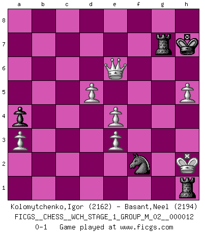 Last move : 0-1 2014 January 30 7:40:53 [Event "FICGS__CHESS__WCH_STAGE_1_GROUP_M_02__000012"] [Site "FICGS"] [Date "2013.07.02"] [Round "1"] [White "Kolomytchenko,Igor"] [Black "Basant,Neel"] [Result "0-1"] [WhiteElo "2162"] [BlackElo "2194"] 1.e4 c5 2.Nf3 d6 3.d4 cxd4 4.Nxd4 Nf6 5.Nc3 a6 6.Be2 e5 7.Nb3 Be7 8.O-O O-O 9.Be3 Be6 10.Qd3 Nc6 11.a3 Rc8 12.Nd5 Nd7 13.c4 a5 14.Nc3 Ra8 15.Qc2 Bg5 16.Rad1 Bxe3 17.fxe3 Qb6 18.Rf3 Ne7 19.Nb5 Nc8 20.Rg3 Kh8 21.Nd2 a4 22.Rf1 Qc6 23.Nc3 Ncb6 24.Nd5 Nc5 25.Qc1 Bd7 26.Nc3 Qc7 27.Qd1 Be6 28.Nd5 Nxd5 29.cxd5 Bd7 30.Bg4 Bb5 31.Be2 Bd7 32.Bg4 f6 33.Bf5 Be8 34.Rh3 g6 35.Bg4 Rb8 36.Qe1 b5 37.Rhf3 Kg7 38.Qh4 b4 39.Rh3 h5 40.Bxh5 gxh5 41.Rg3+ Kh7 42.Rxf6 Qd8 43.Rg7+ Kh8 44.Re7 Qxe7 45.Rh6+ Qh7 46.Rxh7+ Kxh7 47.Qe7+ Rf7 48.Qxd6 bxa3 49.bxa3 Rb2 50.Qxe5 Rxd2 51.Qxh5+ Kg7 52.Qe5+ Rf6 53.h4 Bf7 54.h5 Nd7 55.Qe7 R6f2 56.Qg5+ Kh7 57.Qe7 Rxg2+ 58.Kh1 Rh2+ 59.Kg1 Rdg2+ 60.Kf1 Rf2+ 61.Kg1 Rhg2+ 62.Kh1 Nf6 63.Qxf7+ Rg7 64.Qe6 Rf1+ 65.Kh2 Ng4+ 66.Kh3 Nf2+ 67.Kh2 Rh1+ 0-1 Sicilian : Najdorf, Opovcensky variation Kingside Castling by player White (move 8) Kingside Castling by player Black (move 8) Player Black won this chess game. Follow this game move after move (download)Many Chess players were surprised when after the game, Fischer quietly explained: 'I had already analyzed this possibility' in a position which I thought was not possible to foresee from the opening. (Mikhail Tal) Ein Isolani verdüstert die Stimmung auf dem ganzen Schachbrett. (Savielly Grigorievitsch Tartakower) Cuando veas una buena jugada, trata de encontrar otra mejor. (Emanuel Lasker) Le joueur d'Echecs qui veut atteindre le top est obligé de développer son propre credo créatif. Alexeï Stepanovicth Souétine. Il est facile d'écrire des livres ! Ce qui est difficile, c'est de jouer ! (Alexeï Stepanovicth Souétine) All men can see these tactics whereby I conquer, but what none can see is the strategy out of which victory is evolved. (Sun Tzu)