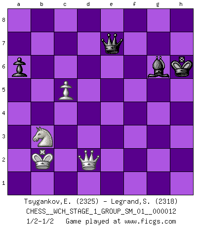 Last move : 1/2-1/2 2014 January 14 21:23:20 [Event "FICGS__CHESS__WCH_STAGE_1_GROUP_SM_01__000012"] [Site "FICGS"] [Date "2013.07.02"] [Round "1"] [White "Tsygankov,Evgeny"] [Black "Legrand,Stephane"] [Result "1/2-1/2"] [WhiteElo "2325"] [BlackElo "2318"] 1.e4 c5 2.Nf3 d6 3.d4 cxd4 4.Nxd4 Nf6 5.Nc3 a6 6.Be3 e5 7.Nb3 Be6 8.Qd2 Be7 9.f3 O-O 10.O-O-O Nbd7 11.g4 b5 12.a3 Nb6 13.Na5 Rc8 14.g5 Nh5 15.Kb1 g6 16.h4 Ng3 17.Rh2 Nxf1 18.Rxf1 Na4 19.Nxa4 bxa4 20.Rd1 Qc7 21.h5 d5 22.exd5 Bxd5 23.hxg6 Bxf3 24.gxh7+ Kh8 25.Rc1 Rb8 26.c4 Bxa3 27.Qe1 Be7 28.Bd2 Bc5 29.Bc3 Bd4 30.Bxd4 exd4 31.Qd2 Rbe8 32.Rf2 Be4+ 33.Ka2 Re5 34.Qf4 Qe7 35.Re1 Re8 36.Qd2 Qxg5 37.Qxd4 f6 38.Ref1 a3 39.Rxf6 axb2 40.Kxb2 Kxh7 41.Nb3 R5e6 42.R6f4 Rd8 43.Qf2 Bg6 44.c5 Qe7 45.Qg3 Rd3 46.Rf7+ Bxf7 47.Rh1+ Rh6 48.Qxd3+ Bg6 49.Rxh6+ Kxh6 50.Qd2+ 1/2-1/2 Sicilian : Najdorf, Byrne (English) attack Kingside Castling by player Black (move 9) Queenside Castling by player White (move 10) 10 pieces endgame at move 48 : White KQRNP , Black KQRBP WHITE : King + 1 Queen 1 Rook 1 Knight 1 Pawn BLACK : King + 1 Queen 1 Rook 1 Bishop 1 Pawn 9 pieces endgame at move 49 : White KQRNP , Black KQBP WHITE : King + 1 Queen 1 Rook 1 Knight 1 Pawn BLACK : King + 1 Queen 1 Bishop 1 Pawn 8 pieces endgame at move 49 : White KQNP , Black KQBP WHITE : King + 1 Queen 1 Knight 1 Pawn BLACK : King + 1 Queen 1 Bishop 1 Pawn This chess game ended in a draw. Follow this game move after move (download)A man that will take back a move at Chess will pick a pocket. (Richard Fenton) Ein Springer auf f6 gegen die eigene Rochadestellung ist schlimmer als ein rostiger Nagel im Knie. (Efim Bogoljubov) Si el ingenio solamente fuese necesario para lucirse, las mujeres serían las mejores jugadoras de Ajedrez del mundo. (Albin) Même si vous avez un bon coup à faire, regardez toujours s'il n'y en a pas un qui lui soit préférable. (Pedro Damiano) Do not put your faith in what statistics say until you have carefully considered what they do not say. (William W. Watt)