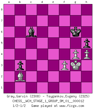 Last move : 1/2-1/2 2013 September 26 18:9:26 [Event "FICGS__CHESS__WCH_STAGE_1_GROUP_SM_01__000012"] [Site "FICGS"] [Date "2013.07.02"] [Round "1"] [White "Gray,Garvin"] [Black "Tsygankov,Evgeny"] [Result "1/2-1/2"] [WhiteElo "2308"] [BlackElo "2325"] 1.e4 g6 2.d4 Bg7 3.Nc3 d6 4.Nf3 a6 5.Bc4 b5 6.Bb3 e6 7.O-O Nd7 8.Re1 Ne7 9.a4 b4 10.Ne2 a5 11.c3 O-O 12.Nf4 bxc3 13.bxc3 Nb6 14.Rb1 Rb8 15.Qc2 Re8 16.h3 h6 17.Ba3 Nc6 18.Ba2 Ba6 19.e5 Qd7 20.exd6 cxd6 21.c4 d5 22.cxd5 Nxd5 23.Bxd5 exd5 24.Rxb8 Rxb8 25.Ne5 Nxe5 26.dxe5 Re8 27.e6 fxe6 28.Qxg6 Qf7 29.Rxe6 Rxe6 30.Qxe6 Qxe6 31.Nxe6 Bc3 32.Bc5 Be2 33.Bd4 Bb4 34.Nc7 Bd1 35.Nxd5 Bxa4 36.Nxb4 axb4 37.g4 h5 38.f3 Kh7 39.Kf2 Kg6 40.Kg3 b3 41.Bb2 Bc6 42.h4 1/2-1/2 Robatsch defense : Two knights variation Kingside Castling by player White (move 7) Kingside Castling by player Black (move 11) 10 pieces endgame at move 36 : White KBNPPP , Black KBPP WHITE : King + 1 Bishop 1 Knight 3 Pawns BLACK : King + 1 Bishop 2 Pawns 9 pieces endgame at move 36 : White KBPPP , Black KBPP WHITE : King + 1 Bishop 3 Pawns BLACK : King + 1 Bishop 2 Pawns This chess game ended in a draw. Follow this game move after move (download)I had a toothache during the first game. In the second game I had a headache. In the third game it was an attack of rheumatism. In the fourth game, I wasn't feeling well. And in the fifth game? Well, must one have to win every game ? (Siegbert Tarrasch) Im Wettkampf zwischen starken Meistern kommen Fehler sehr selten vor, deshalb ist es mit bloßem Warten nicht getan. (José Raúl Capablanca) Tu sabes, camarada Pachman, no disfruto el ser un Ministro, preferería jugar al Ajedrez como tu. (Che Guevara) Le plus grand jeu de l'esprit jamais inventé, plus vous l'apprenez, plus vous y prenez du plaisir. (Garry Kasparov) Life is like a game of cards: the hand you are dealt represents determinism; the way you play it is free will. (Jawaharlal Nehru)