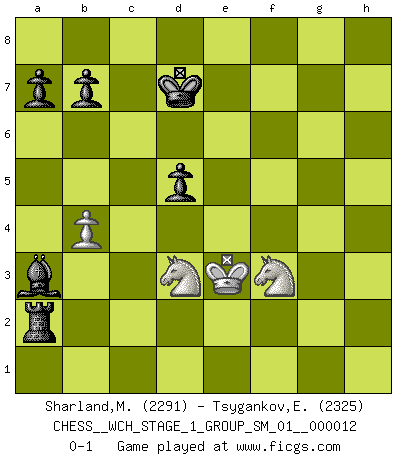 Last move : 0-1 2013 December 11 16:30:21 [Event "FICGS__CHESS__WCH_STAGE_1_GROUP_SM_01__000012"] [Site "FICGS"] [Date "2013.07.02"] [Round "1"] [White "Sharland,Michael"] [Black "Tsygankov,Evgeny"] [Result "0-1"] [WhiteElo "2291"] [BlackElo "2325"] 1.d4 Nf6 2.c4 g6 3.Nc3 Bg7 4.e4 O-O 5.Nf3 d6 6.Be2 e5 7.O-O Nc6 8.d5 Ne7 9.Ne1 Nd7 10.Be3 f5 11.f3 f4 12.Bf2 g5 13.Rc1 Ng6 14.Nd3 Nf6 15.c5 Rf7 16.Kh1 Bf8 17.a3 h5 18.cxd6 cxd6 19.Rg1 g4 20.Re1 Bh6 21.Rc2 Bd7 22.b3 Rg7 23.Bf1 g3 24.hxg3 fxg3 25.Bxg3 h4 26.Bf2 Nh5 27.Ne2 Qf6 28.Rc7 h3 29.gxh3 Nh4 30.f4 exf4 31.e5 Qg5 32.Rxd7 Rxd7 33.Nc3 Ng3+ 34.Bxg3 fxg3 35.Bg2 Nxg2 36.Kxg2 Qd2+ 37.Qxd2 Bxd2 38.Ne4 Bxe1 39.Nf6+ Kf7 40.Nxd7 Bc3 41.Kxg3 Rg8+ 42.Kf3 Ke7 43.Nf6 Rh8 44.Kg4 Bxe5 45.Ne4 Rg8+ 46.Kf5 Rf8+ 47.Kg4 Rf1 48.h4 Bh2 49.Ndf2 Rb1 50.Nd2 Rg1+ 51.Kf3 Rg3+ 52.Ke2 Bg1 53.Nfe4 Re3+ 54.Kf1 Bh2 55.Ng5 Be5 56.Ngf3 Bg7 57.Kf2 Rd3 58.Ke2 Rxd5 59.Nc4 Bf6 60.Ne3 Rh5 61.Kd2 Ke6 62.Ke2 Bxh4 63.Nd4+ Ke7 64.b4 Bf6 65.Nf3 d5 66.Ng4 Bb2 67.Nf2 Bxa3 68.Nd3 Rh6 69.Nd4 Rh2+ 70.Ke3 Kd7 71.Nf3 Ra2 0-1 Alvin Alcala Amazing game! King's Indian : 4.e4 Kingside Castling by player Black (move 4) Kingside Castling by player White (move 7) 10 pieces endgame at move 67 : White KNNP , Black KRBPPP WHITE : King + 2 Knights 1 Pawn BLACK : King + 1 Rook 1 Bishop 3 Pawns Player Black won this chess game. Follow this game move after move (download)Chess is the art of analysis. (Mikhail Botvinnik) Frage des Reporters: -Welche besonderen Umstände rechtfertigen das Anhalten der Uhren während einer Turnierpartie? Antwort: -Einen Fotographen zu strangulieren. (Siegbert Tarrasch) Prefiero perder una partida realmente buena, que ganar una mala. (David Levy) Karpov est une pièce de musée. (Garry Kasparov) They say poker is a zero-sum game. It must be, because every time I play my sum ends up zero. (Max Shapiro)