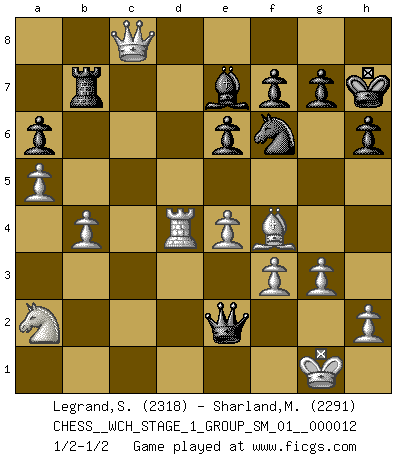 Last move : 1/2-1/2 2013 November 4 22:10:20 [Event "FICGS__CHESS__WCH_STAGE_1_GROUP_SM_01__000012"] [Site "FICGS"] [Date "2013.07.02"] [Round "1"] [White "Legrand,Stephane"] [Black "Sharland,Michael"] [Result "1/2-1/2"] [WhiteElo "2318"] [BlackElo "2291"] 1.Nf3 Nf6 2.c4 e6 3.g3 d5 4.d4 Be7 5.Bg2 O-O 6.O-O dxc4 7.Qc2 a6 8.a4 Bd7 9.Rd1 Bc6 10.Nc3 Bxf3 11.Bxf3 Nc6 12.Bxc6 bxc6 13.a5 Rb8 14.Ra4 Rb4 15.Na2 Rxa4 16.Qxa4 h6 17.f3 Qd6 18.e4 c5 19.Bf4 Qd7 20.Qxc4 Rb8 21.Rd2 cxd4 22.Rxd4 Qb5 23.Qxc7 Rb7 24.Qc8+ Kh7 25.b4 Qe2 1/2-1/2 Reti Opening Kingside Castling by player Black (move 5) Kingside Castling by player White (move 6) This chess game ended in a draw. Follow this game move after move (download)We don't really know how the game was invented, though there are suspicions. As soon as we discover the culprits, we'll let you know. (Bruce Pandolfini) Ich würde die 30 stärksten Spieler der USA im Simultanspiel besiegen. (José Raúl Capablanca) Mis oponentes también hacen buenas movidas. A veces yo no tomo esas cosas en consideración. (Bobby Fischer) Il vaut toujours mieux jouer un plan faux de façon logique que de n'avoir pas de plan du tout. (Victor Kortchnoï) Those parts of the system that you can hit with a hammer (not advised) are called hardware; those program instructions that you can only curse at are called software. (Anonymous)