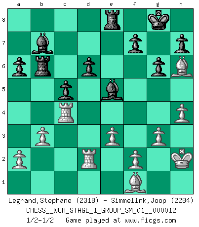 Last move : 1/2-1/2 2013 October 13 22:6:11 [Event "FICGS__CHESS__WCH_STAGE_1_GROUP_SM_01__000012"] [Site "FICGS"] [Date "2013.07.02"] [Round "1"] [White "Legrand,Stephane"] [Black "Simmelink,Joop"] [Result "1/2-1/2"] [WhiteElo "2318"] [BlackElo "2284"] 1.Nf3 Nf6 2.c4 g6 3.d4 Bg7 4.g3 O-O 5.Bg2 d6 6.O-O Nc6 7.Nc3 a6 8.Bf4 Bd7 9.Rc1 Rb8 10.Qd2 b5 11.Nd5 bxc4 12.Nxf6+ Bxf6 13.Bh6 Re8 14.Rxc4 e5 15.dxe5 Nxe5 16.Nxe5 Bxe5 17.b3 Bb5 18.R4c1 c5 19.Rfd1 Qc7 20.e3 Rb6 21.h4 Qc8 22.Qa5 Rb8 23.Kh2 Bc6 24.Bh3 Qb7 25.Rd2 Bf3 26.Bf1 Qb6 27.Qxb6 Rxb6 28.Rc4 Bb7 1/2-1/2 Reti Opening Kingside Castling by player Black (move 4) Kingside Castling by player White (move 6) This chess game ended in a draw. Follow this game move after move (download)Place the contents of the Chess box in a hat, shake them up vigorously, pour them on the board from a height of two feet, and you get the style of Steinitz. (H. E. Bird) Habe Mut, dich deines eigenen Verstandes zu bedienen. (Immanuel Kant) ¿Que sería del Ajedrez sin errores graciosos?. (Kurt Richter) Les échecs, c'est l'imagination. (David Bronstein) Optimism is a variety of information deficit. Sometimes especially true for correspondence chess games. (Michael Aigner)