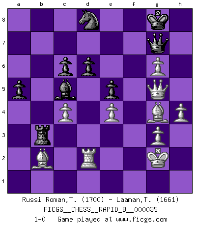 Last move : 1-0 2007 July 1 11:16:1 [Event "FICGS__CHESS__RAPID_B__000035"] [Site "FICGS"] [Date "2007.02.04"] [Round "1"] [White "Russi Roman,Tano-Urayoan"] [Black "Laaman,Thomas"] [Result "1-0"] [WhiteElo "1700"] [BlackElo "1661"] 1.c4 e5 2.Nc3 Nf6 3.Nf3 Nc6 4.g3 Bc5 5.Bg2 O-O 6.O-O d6 7.d3 Be6 8.a3 Bb6 9.b4 Qd7 10.Bg5 Ng4 11.Bd2 Nf6 12.b5 Ne7 13.Ng5 c6 14.Nxe6 fxe6 15.Rb1 Nf5 16.bxc6 bxc6 17.Ne4 Nxe4 18.dxe4 Nh6 19.Bb4 Rad8 20.Bf3 Nf7 21.h4 a5 22.Bd2 Rb8 23.Qa4 Rb7 24.Kg2 Rfb8 25.Rb3 Nd8 26.Bg4 Bc5 27.Rfb1 Qf7 28.e3 Rxb3 29.Rxb3 Ra8 30.Bb4 h5 31.Be2 Nb7 32.Be1 Ra6 33.f4 g6 34.Rd3 exf4 35.exf4 e5 36.Qc2 Rb6 37.Bc3 Qe8 38.Qd2 Rb3 39.f5 Rxa3 40.Qh6 Ra2 41.Rd2 Ra3 42.fxg6 Qe7 43.Rd3 Qg7 44.Qxh5 Ra2 45.Rd2 Ra3 46.Bb2 Rb3 47.Bg4 Nd8 48.Qg5 1-0 English Opening Kingside Castling by player Black (move 5) Kingside Castling by player White (move 6) Player White won this chess game. Follow this game move after move (download)Bobby Fischer is the greatest Chess player who has ever lived. (Ken Smith) Ich habe Putins Aufstieg an die Macht beobachtet und seine Politik, die demokratischen Institutionen meines Landes zu zerstören. (Garry Kasparov) Las Aperturas te enseñan aperturas. ¡Los Finales te enseñan Ajedrez!. (Stephan Gerzadowicz) Ne tendez aucun piège pour le plaisir ! Ne jouez rien dans l'espoir que l'adversaire réagisse de façon stupide ! Prenez toujours pour acquis que l'adversaire va trouver le meilleur coup ! Ne jouez jamais de coup dans l'espoir que l'adversaire ne voie pas la menace ! Chacun de vos coups doit améliorer la position d'une façon ou d'une autre. Some people are so afraid to die that they never begin to live. (Henry Van Dyke)