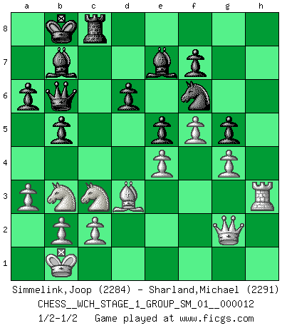 Last move : 1/2-1/2 2013 August 28 16:17:17 [Event "FICGS__CHESS__WCH_STAGE_1_GROUP_SM_01__000012"] [Site "FICGS"] [Date "2013.07.02"] [Round "1"] [White "Simmelink,Joop"] [Black "Sharland,Michael"] [Result "1/2-1/2"] [WhiteElo "2284"] [BlackElo "2291"] 1.e4 c5 2.Nf3 d6 3.d4 cxd4 4.Nxd4 Nf6 5.Nc3 a6 6.Bg5 e6 7.f4 Nbd7 8.Qf3 Qc7 9.O-O-O b5 10.Bd3 Bb7 11.a3 Be7 12.f5 e5 13.Nb3 h6 14.Bxf6 Nxf6 15.g4 O-O-O 16.Kb1 Kb8 17.h4 Rc8 18.Rh3 g5 19.hxg5 hxg5 20.Rdh1 Rxh3 21.Rxh3 Qb6 22.Qg2 1/2-1/2 Sicilian : Najdorf, 7.f4 Queenside Castling by player White (move 9) Queenside Castling by player Black (move 15) This chess game ended in a draw. Follow this game move after move (download)Of all my Russian books, the defense contains and diffuses the greatest 'warmth' which may seem odd seeing how supremely abstract Chess is supposed to be. (Vladimir Nabokov) Ein Schachspiel besteht aus drei Phasen: Die erste, wenn du hofftst den Vorteil zu haben, die zweite, wenn du glaubst einen Vorteil zu haben, und die dritte.... wenn du weißt Du wirst verlieren. (Savielly Grigorievitsch Tartakower) El Ajedrez se juega con la mente... ¡no con las manos!. (Renaud y Kahn) La conception d'un plan est le processus par lequel un joueur exploite les avantages de sa position tout en s'efforçant d'en réduire au minimum les inconvénients. Afin de garantir le succès, un plan doit toujours se fonder sur un diagnostic objectif des particularités d'une position. La conception d'un plan est d'autant plus difficile que la position est équilibrée, et grandement facilitée lorsqu'il n'existe qu'un seul plan susceptible de répondre aux exigences de la position. (Harry Golombek) Hardware: the parts of a computer that can be kicked. (Jeff Persis)