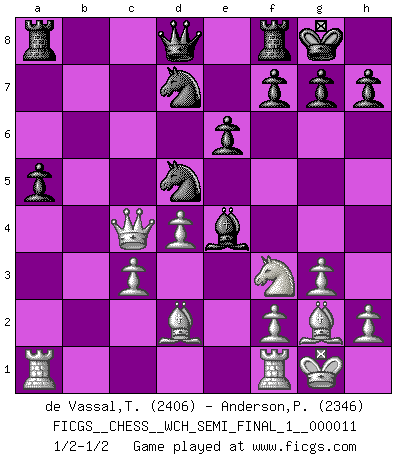 Last move : 1/2-1/2 2013 September 26 8:31:28 [Event "FICGS__CHESS__WCH_SEMI_FINAL_1__000011"] [Site "FICGS"] [Date "2013.07.02"] [Round "1"] [White "de Vassal,Thibault"] [Black "Anderson,Peter W."] [Result "1/2-1/2"] [WhiteElo "2406"] [BlackElo "2346"] 1.d4 d5 2.c4 e6 3.Nc3 c6 4.Nf3 dxc4 5.a4 Bb4 6.e4 b5 7.Bd2 a5 8.axb5 Bxc3 9.bxc3 cxb5 10.Qb1 Ba6 11.g3 Ne7 12.Bg2 Nd7 13.O-O O-O 14.Bf4 Bb7 15.Qxb5 Bxe4 16.Qxc4 Nd5 17.Bd2 1/2-1/2 QGD : Semi-Slav, Noteboom variation Kingside Castling by player White (move 13) Kingside Castling by player Black (move 13) This chess game ended in a draw. Follow this game move after move (download)If a ruler does not understand Chess, how can he rule over a kingdom ? (King Khusros II) Wer mein Gambit spielt, muß bereit sein, alle Brücken hinter sich abzubrechen. Es verändert den ganzen Menschen. Es wirkt wie ein Zauberstab und fördert verkümmerte, gute Charakter- eigenschaften wieder zu Tage. (Emil Joseph Diemer) Realmente no sabemos como el juego fue inventado, aunque hay sospechas. Tan pronto como descubramos a los culpables, se los haremos saber. (Bruce Pandolfini) Aux échecs, les retours au sommet sont rares : les dommages psychologiques consécutifs à une défaite sont trop sévères. (Daily Telegraph) Cactus - It is depressed cucumber. (Ilmars Cirulis)