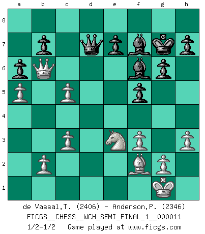 Last move : 1/2-1/2 2013 October 24 9:20:18 [Event "FICGS__CHESS__WCH_SEMI_FINAL_1__000011"] [Site "FICGS"] [Date "2013.07.02"] [Round "5"] [White "de Vassal,Thibault"] [Black "Anderson,Peter W."] [Result "1/2-1/2"] [WhiteElo "2406"] [BlackElo "2346"] 1.e4 g6 2.d4 Bg7 3.Nc3 d6 4.Be3 a6 5.a4 Nf6 6.h3 O-O 7.Nf3 d5 8.e5 Ne4 9.Nxe4 dxe4 10.Ng5 c5 11.dxc5 Qc7 12.c3 Nc6 13.Qc2 Nxe5 14.Nxe4 Be6 15.Be2 Rad8 16.O-O Nc4 17.Bxc4 Bxc4 18.Rfd1 f5 19.Nd2 Bd5 20.f3 Rd7 21.Nf1 Rfd8 22.Bf2 Qc6 23.Re1 Bf7 24.Rad1 Rxd1 25.Rxd1 Rxd1 26.Qxd1 Bf6 27.a5 Qb5 28.Qd8+ Kg7 29.Qb6 Qd7 30.Ne3 1/2-1/2 Robatsch (Modern) defense Kingside Castling by player Black (move 6) Kingside Castling by player White (move 16) This chess game ended in a draw. Follow this game move after move (download)Chess is above all, a fight ! (Emanuel Lasker) Wenn Schach ein enormer Dschungel ist, der seine Myriaden von Geheimnissen nicht preisgeben will, dann sind Computer die Kettensägen einer gewaltigen ökologisch unsensiblen Nutzholzfirma. (Nigel Short) Antes de los Finales, los dioses han colocado el Juego Medio. (Siegbert Tarrasch) Seul un grand joueur sait à quel point il joue faiblement. (Xavier Tartacover) Any activity becomes creative when the doer cares about doing it right or doing it better. (John Updike)