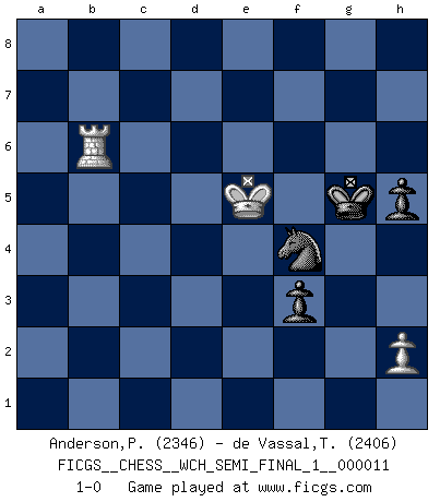 Last move : 1-0 2014 January 10 20:15:41 [Event "FICGS__CHESS__WCH_SEMI_FINAL_1__000011"] [Site "FICGS"] [Date "2013.07.02"] [Round "6"] [White "Anderson,Peter W."] [Black "de Vassal,Thibault"] [Result "1-0"] [WhiteElo "2346"] [BlackElo "2406"] 1.d4 Nf6 2.c4 e6 3.Nc3 Bb4 4.a3 Bxc3+ 5.bxc3 O-O 6.e3 c5 7.Bd3 d5 8.cxd5 Qxd5 9.Nf3 b6 10.c4 Qc6 11.O-O Bb7 12.Re1 Rd8 13.Bb2 Nbd7 14.a4 a5 15.Qe2 Qc7 16.Nd2 Rac8 17.f3 Nf8 18.Rab1 N6d7 19.Qf2 Bc6 20.Ra1 Ng6 21.Nb1 Ndf8 22.Nc3 Qd6 23.Bf1 cxd4 24.exd4 Qxd4 25.Qxd4 Rxd4 26.Nd5 Rh4 27.Nxb6 Rb8 28.c5 Nd7 29.Rec1 f6 30.Bc3 Nxc5 31.Rab1 Be8 32.g3 Rh5 33.g4 Rg5 34.Bd2 Nxa4 35.Bxg5 fxg5 36.Nc8 Rxb1 37.Rxb1 Bc6 38.Ra1 Kf7 39.Na7 Bd7 40.Bb5 Nc5 41.Rxa5 Kf6 42.Kf2 Nf4 43.Bxd7 Nxd7 44.Nc8 Ne5 45.Nd6 Kg6 46.Ra4 h6 47.Nc4 Nxc4 48.Rxc4 Kf6 49.Ke3 Ke5 50.Re4+ Kd5 51.Kf2 Nd3+ 52.Kg3 e5 53.Ra4 g6 54.Ra6 Nf4 55.Kf2 h5 56.Ke3 Ng2+ 57.Kd2 Nf4 58.Ra5+ Kd4 59.gxh5 gxh5 60.Ra1 g4 61.Ra4+ Kd5 62.Ke3 Ke6 63.Ke4 Kf6 64.Ra6+ Kg5 65.Rb6 gxf3 66.Kxe5 1-0 Nimzo-Indian : Saemisch variation Kingside Castling by player Black (move 5) Kingside Castling by player White (move 11) 10 pieces endgame at move 59 : White KRPPP , Black KNPPP WHITE : King + 1 Rook 3 Pawns BLACK : King + 1 Knight 3 Pawns 9 pieces endgame at move 59 : White KRPP , Black KNPPP WHITE : King + 1 Rook 2 Pawns BLACK : King + 1 Knight 3 Pawns 8 pieces endgame at move 65 : White KRP , Black KNPPP WHITE : King + 1 Rook 1 Pawn BLACK : King + 1 Knight 3 Pawns 7 pieces endgame at move 66 : White KRP , Black KNPP WHITE : King + 1 Rook 1 Pawn BLACK : King + 1 Knight 2 Pawns Player White won this chess game. Follow this game move after move (download)Chess problems demand from the composer the same virtues that characterize all worthwhile art: originality, invention, conciseness, harmony, complexity, and splendid insincerity. (Vladimir Nabokov) Wenn Du nicht kämpfst, um anderen etwas zu beweisen, sondern nur für Dich selbst, dann bist du fast unbesiegbar. (Garry Kasparov) El pensamiento metódico es mas útil en el Ajedrez que la inspiración. (C. J. S. Purdy) Les Echecs ont trois composantes : le temps, l'espace et le matériel en dernier. (Mikhail Tal) Remember : Your focus determines your reality. (Qui-Gon Jinn in Star Wars ep.1)