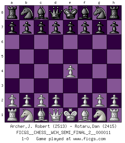 Last move : 1-0 2013 July 4 23:18:59 [Event "FICGS__CHESS__WCH_SEMI_FINAL_2__000011"] [Site "FICGS"] [Date "2013.07.02"] [Round "1"] [White "Archer,J. Robert"] [Black "Rotaru,Dan"] [Result "1-0"] [WhiteElo "2513"] [BlackElo "2415"] 1.e4 1-0 King's pawn Opening Player White won this chess game. Follow this game move after move (download)The hallmark of the artist is simplicity. (Larry Evans) Mein erstes Ziel war nicht, die Partie zu gewinnen, sondern eine Figur zu opfern. -- der junge (Wilhelm Steinitz) El Ajedrez es realmente noventa y nueve por ciento calculación. (Soltis) Je fais ceci parce que dans cinquante coups j'obtiendrai cela; je m'appelle Mikhail Moisevitch Botvinnik. (Botvinnik) Experiences are the keys to life. (Daniel Parmet)