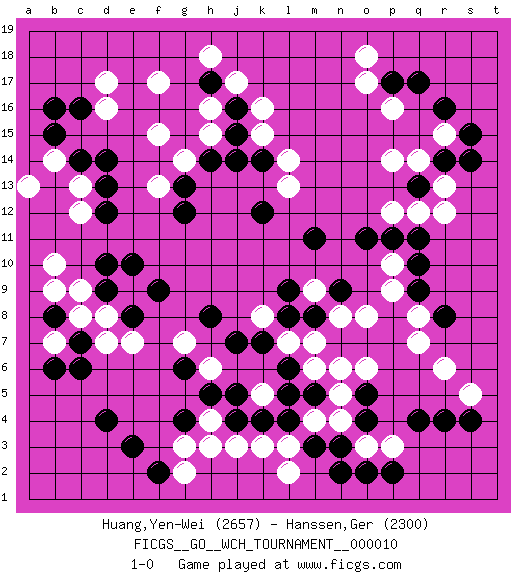 Last move : 1-0 2014 January 17 11:15:58 [Event "FICGS__GO__WCH_TOURNAMENT__000010"] [Site "FICGS"] [Date "2013.07.02"] [Round "1"] [Black "Huang,Yen-Wei"] [White "Hanssen,Ger"] [Result "1-0"] [Rating 1 "2657"] [Rating 2 "2300"] 1.r16 d16 2.q4 p16 3.d4 q14 4.r14 r13 5.q13 r15 6.s14 p14 7.s15 r12 8.c14 f17 9.b16 c13 10.d13 c12 11.d14 b14 12.b15 a13 13.c16 d17 14.d10 b10 15.d12 c9 16.e8 k3 17.m3 g3 18.e3 k5 19.j4 j3 20.c7 b7 21.b8 c8 22.b6 d7 23.c6 e9 24.d9 d8 25.f9 k16 26.e10 b9 27.m5 r6 28.r4 q8 29.p17 o17 30.q17 o18 31.j16 j17 32.h17 h16 33.j15 h18 34.q9 p9 35.q10 p10 36.r8 q7 37.q11 q12 38.p11 p12 39.o11 o8 40.m11 k15 41.m8 o6 42.o4 m9 43.n9 n8 44.l9 m7 45.l8 l7 46.k7 k8 47.l6 m6 48.l5 n5 49.k4 n4 50.n3 h4 51.j5 m4 52.l4 l3 53.j7 o3 54.o5 n6 55.o2 p3 56.p2 s5 57.k14 l14 58.j14 l13 59.k12 h15 60.h14 f15 61.f2 l2 62.n2 g2 63.s4 g14 64.g13 f13 65.g12 g7 66.g6 h6 67.h5 e7 68.g4 h3 69.h8 1-0 Here are the names of the openings (joseki) played in the four corners : Corner q16 : r16 p16 Komoku (Somok, Xiao~mu`) 3-4 Point. The komoku (3-4) point is the traditional corner enclosure move.. Ikken Takagakari (Hankan Nop'dakeolch'im, Yi Gaogua`jiao~, 1-Space High Approach). The 5-4 approach move has become more popular in modern times, as modern Go emphasizes speed and influence. Corner d16 : d16 c14 Hoshi (Hwajeom, Seongjeom, Xingwei`) 4-4 Point. The star or hoshi (4-4) point, emphasizing influence at the potential expense of territory. Ikken Kakari (Hankan Keolch'im, Yi Gua`jiao~, 1-Space Low Approach). Black 2 is the standard approach move to the 4-4. Corner d4 : d4 c9 Hoshi (Hwajeom, Seongjeom, Xingwei`) 4-4 Point. The star or hoshi (4-4) point, emphasizing influence at the potential expense of territory. Player Black won this Go (weiqi, baduk) game. Follow this game move after move (download)Keep away from thickness. (Anonymous) Always be a first-rate version of yourself, instead of a second-rate version of somebody else. (Judy Garland)