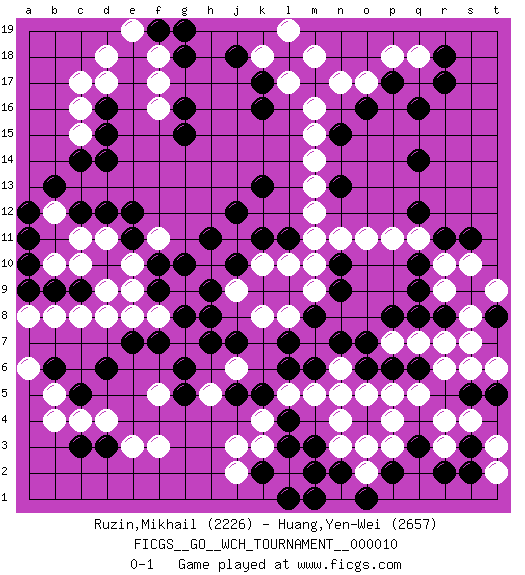 Last move : 0-1 2013 December 22 8:4:5 [Event "FICGS__GO__WCH_TOURNAMENT__000010"] [Site "FICGS"] [Date "2013.07.02"] [Round "1"] [Black "Ruzin,Mikhail"] [White "Huang,Yen-Wei"] [Result "0-1"] [Rating 1 "2226"] [Rating 2 "2657"] 1.q16 d17 2.q3 c4 3.q9 f3 4.d15 c15 5.c14 c16 6.d14 f17 7.d10 d8 8.f9 q5 9.o4 r3 10.r2 r4 11.s2 q7 12.r8 r7 13.n9 n6 14.l4 o17 15.q14 q18 16.r17 m16 17.k17 l17 18.k16 m14 19.k13 j3 20.c9 c8 21.c3 d4 22.d3 e3 23.g16 f16 24.g15 l2 25.m3 b5 26.p6 p7 27.n15 m15 28.p17 p18 29.o16 n17 30.q6 p5 31.o6 o5 32.o7 r6 33.n7 p3 34.p2 n4 35.m6 o2 36.o3 n3 37.o1 p4 38.n2 o3 39.m2 m12 40.s5 t3 41.t5 s8 42.s3 s4 43.s9 s6 44.t8 t6 45.k2 r10 46.q10 r9 47.q8 s7 48.r11 s10 49.s11 t9 50.n13 m13 51.k11 f8 52.g8 g7 53.h7 g9 54.h8 e9 55.f10 e10 56.e11 f11 57.g10 d11 58.e12 c11 59.f7 e8 60.g6 k3 61.l3 j2 62.d12 b12 63.c12 b10 64.l18 m18 65.r18 k18 66.j18 l19 67.d16 c17 68.b13 m10 69.b9 b8 70.a10 d9 71.a12 c10 72.a9 a8 73.a11 o11 74.g18 f18 75.f19 e19 76.g19 d18 77.l9 q11 78.q12 p11 79.p8 m5 80.l1 l10 81.n10 n11 82.l11 m11 83.k9 k10 84.j10 j11 85.h11 m7 86.n5 n1 87.m1 n6 88.l6 m9 89.m8 l8 90.l7 j9 91.j12 k8 92.d6 f5 93.e7 j6 94.b6 a6 95.c5 b4 96.j5 h5 97.h9 l5 98.k5 n5 99.j7 k4 100.g5 t2 0-1 Here are the names of the openings (joseki) played in the four corners : Corner d16 : d17 d15 Komoku (Somok, Xiao~mu`) 3-4 Point. The komoku (3-4) point is the traditional corner enclosure move.. Ikken Takagakari (Hankan Nop'dakeolch'im, Yi Gaogua`jiao~, 1-Space High Approach). The 5-4 approach move has become more popular in modern times, as modern Go emphasizes speed and influence. Corner q16 : q16 o17 Hoshi (Hwajeom, Seongjeom, Xingwei`) 4-4 Point. The star or hoshi (4-4) point, emphasizing influence at the potential expense of territory. Ikken Kakari (Hankan Keolch'im, Yi Gua`jiao~, 1-Space Low Approach). White 2 is the standard approach move to the 4-4. Player White won this Go (weiqi, baduk) game. Follow this game move after move (download)Capture what you cut off. (Anonymous) Patience, use the Force, think ! (Obi-Wan Kenobi in Star Wars ep.2)